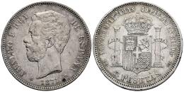 Centenario de la Peseta (1868-1931). Amadeo I (1871-1873). 5 pesetas. 1871*18-74. Madrid. DEM. (Cal-5). Ag. 24,83 g. Golpecitos en el canto. Rayitas. MBC. Est...45,00.
