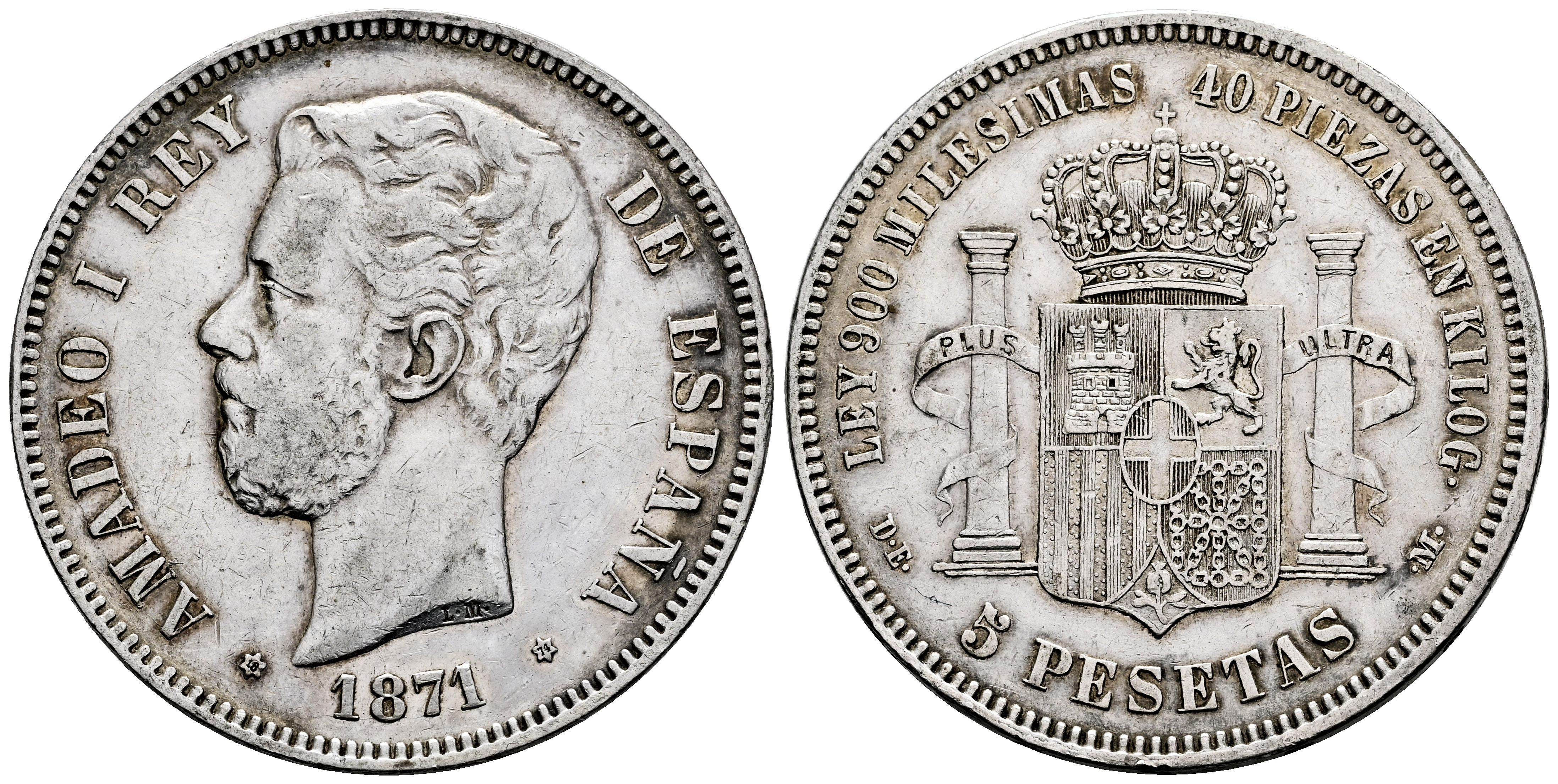 Centenario de la Peseta (1868-1931). Amadeo I (1871-1873). 5 pesetas. 1871*18-74. Madrid. DEM. (Cal-5). Ag. 25,13 g. Ligeramente limpiada. MBC/MBC+. Est...50,00.
