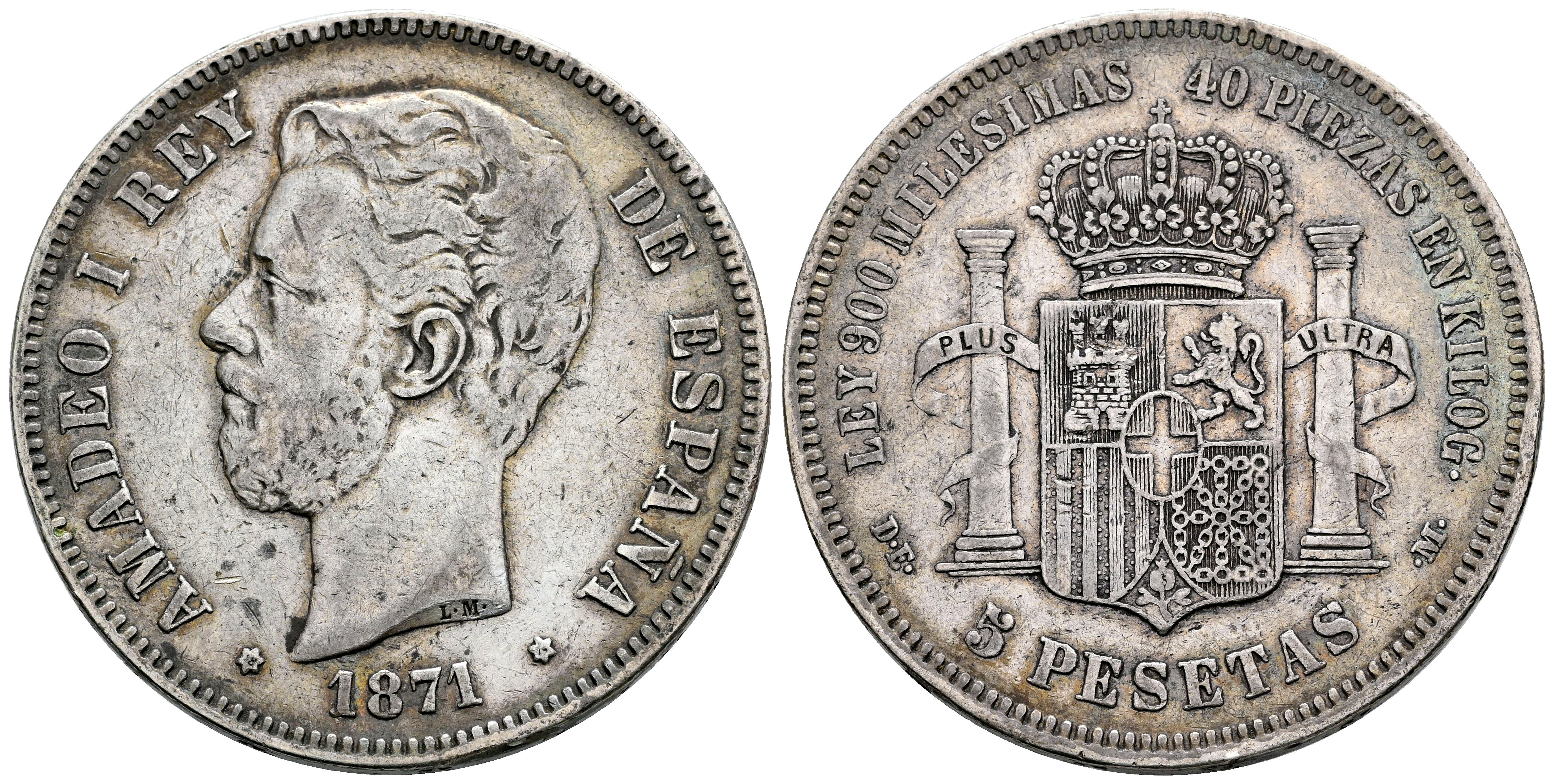 Centenario de la Peseta (1868-1931). Amadeo I (1871-1873). 5 pesetas. 1871*18-74. Madrid. DEM. (Cal-5). Ag. 24,82 g. MBC. Est...35,00.