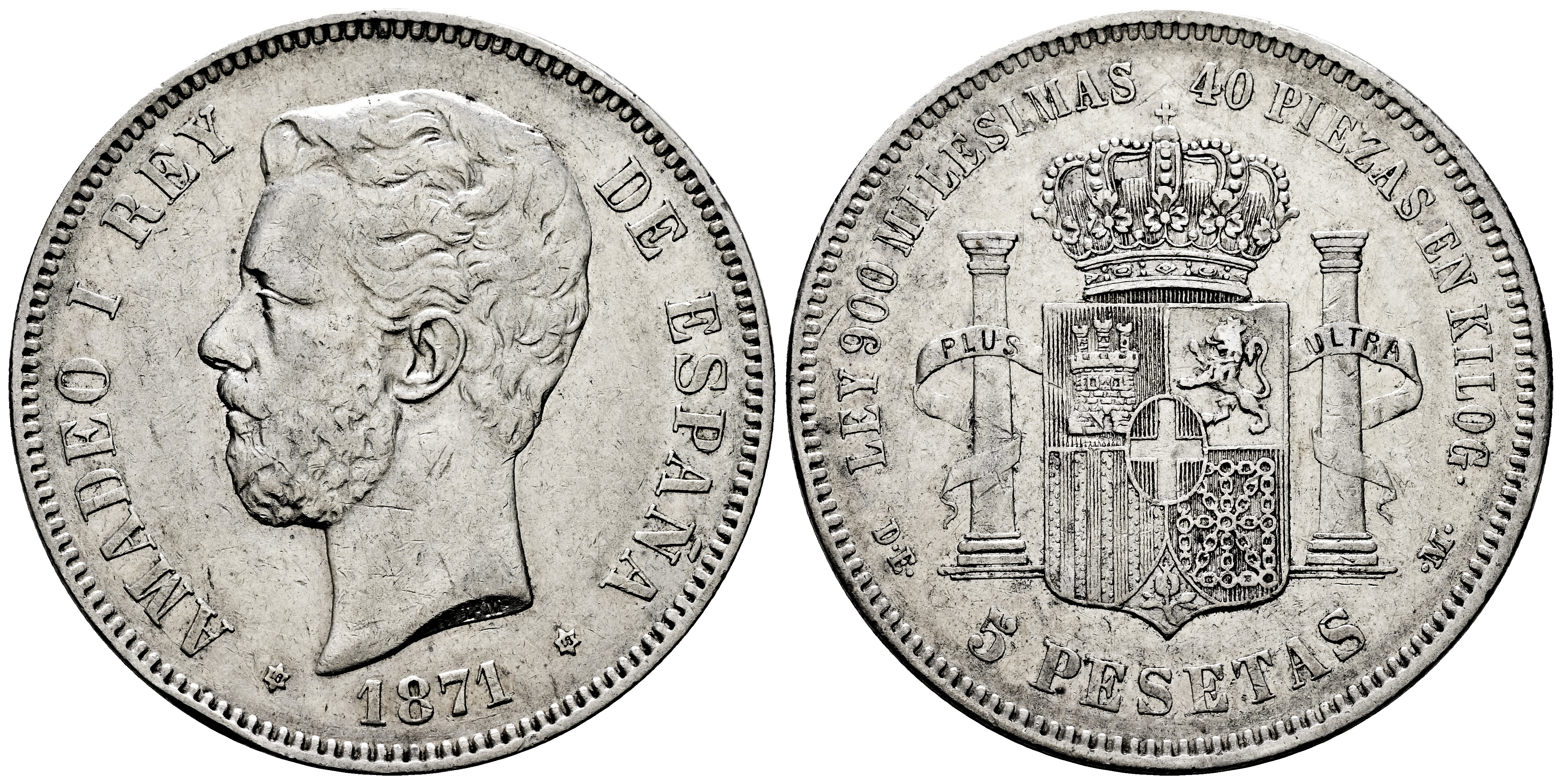Centenario de la Peseta (1868-1931). Amadeo I (1871-1873). 5 pesetas. 1871*18-18. Madrid. DEM. (Cal-6). Ag. 24,83 g. Limpiada. Rara. MBC. Est...150,00.