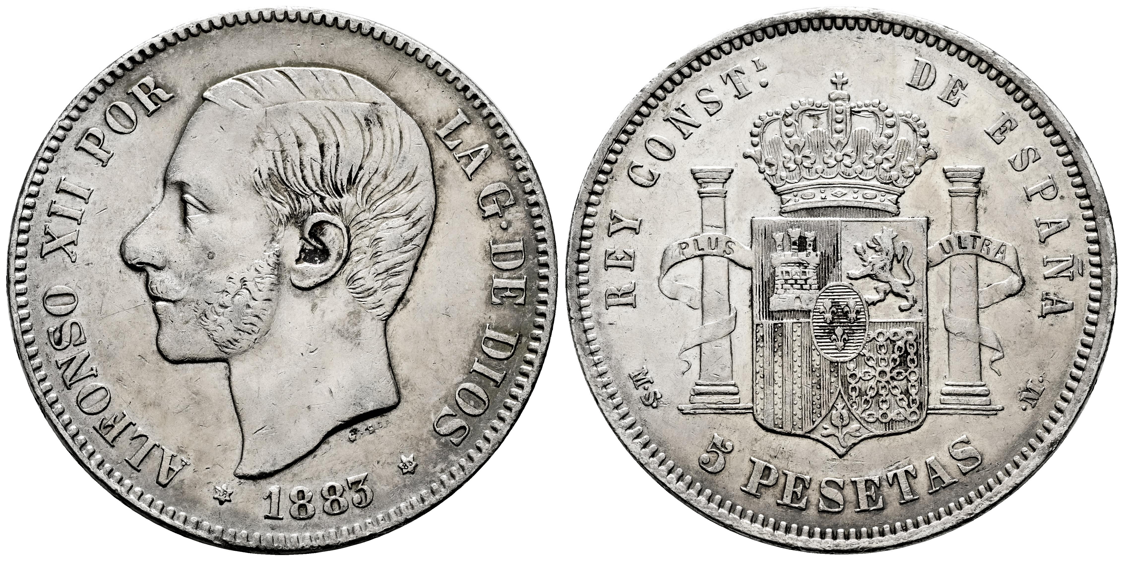 Centenario de la Peseta (1868-1931). Alfonso XII (1874-1885). 5 pesetas. 1883*18-83. Madrid. MSM. (Cal-55). Ag. 25,06 g. Limpiada. MBC. Est...50,00.