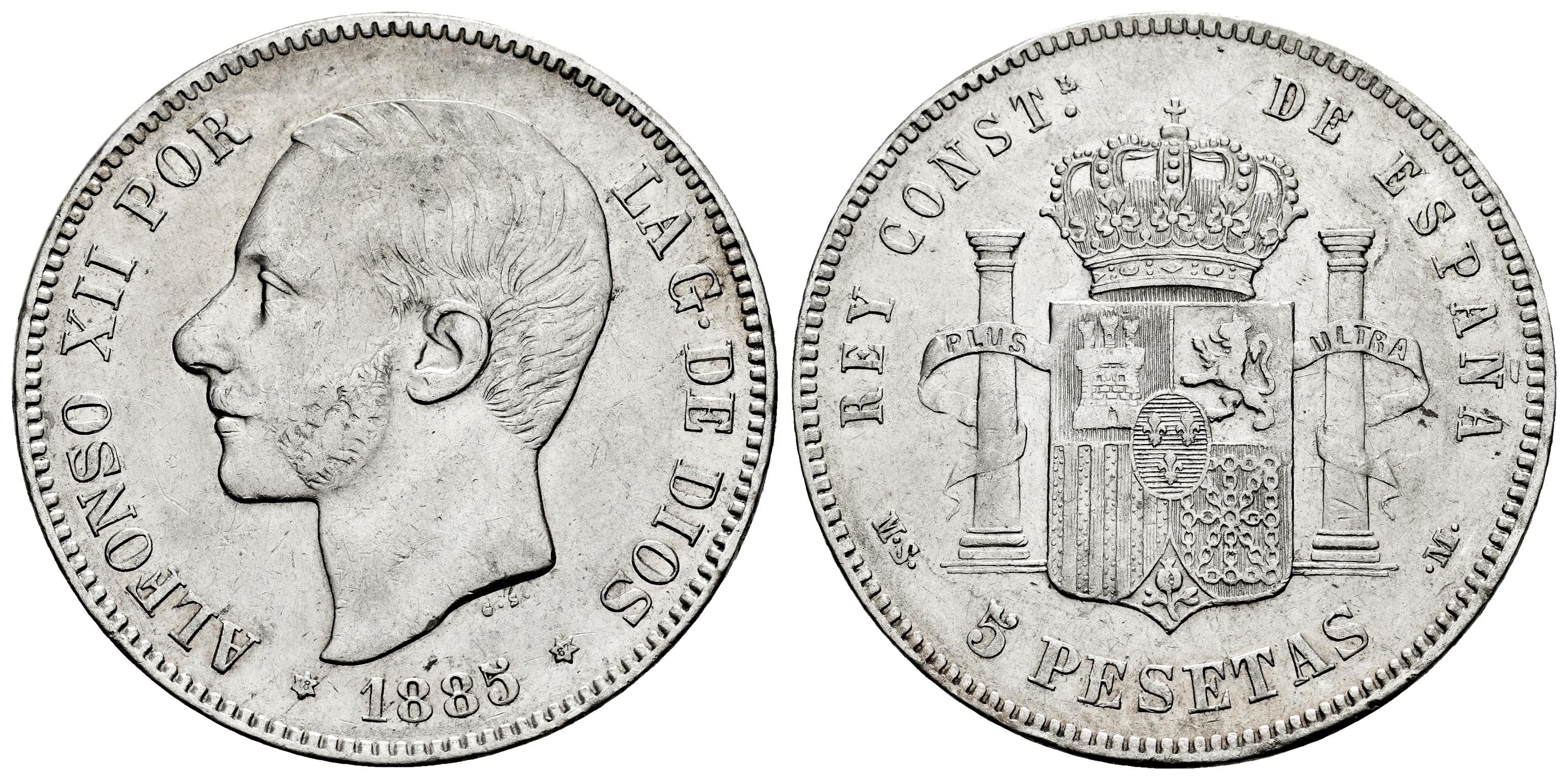 Centenario de la Peseta (1868-1931). Alfonso XII (1874-1885). 5 pesetas. 1885*18-87. Madrid. MSM. (Cal-62). Ag. 24,98 g. Rayitas. Golpes en el canto. MBC+. Est...40,00.