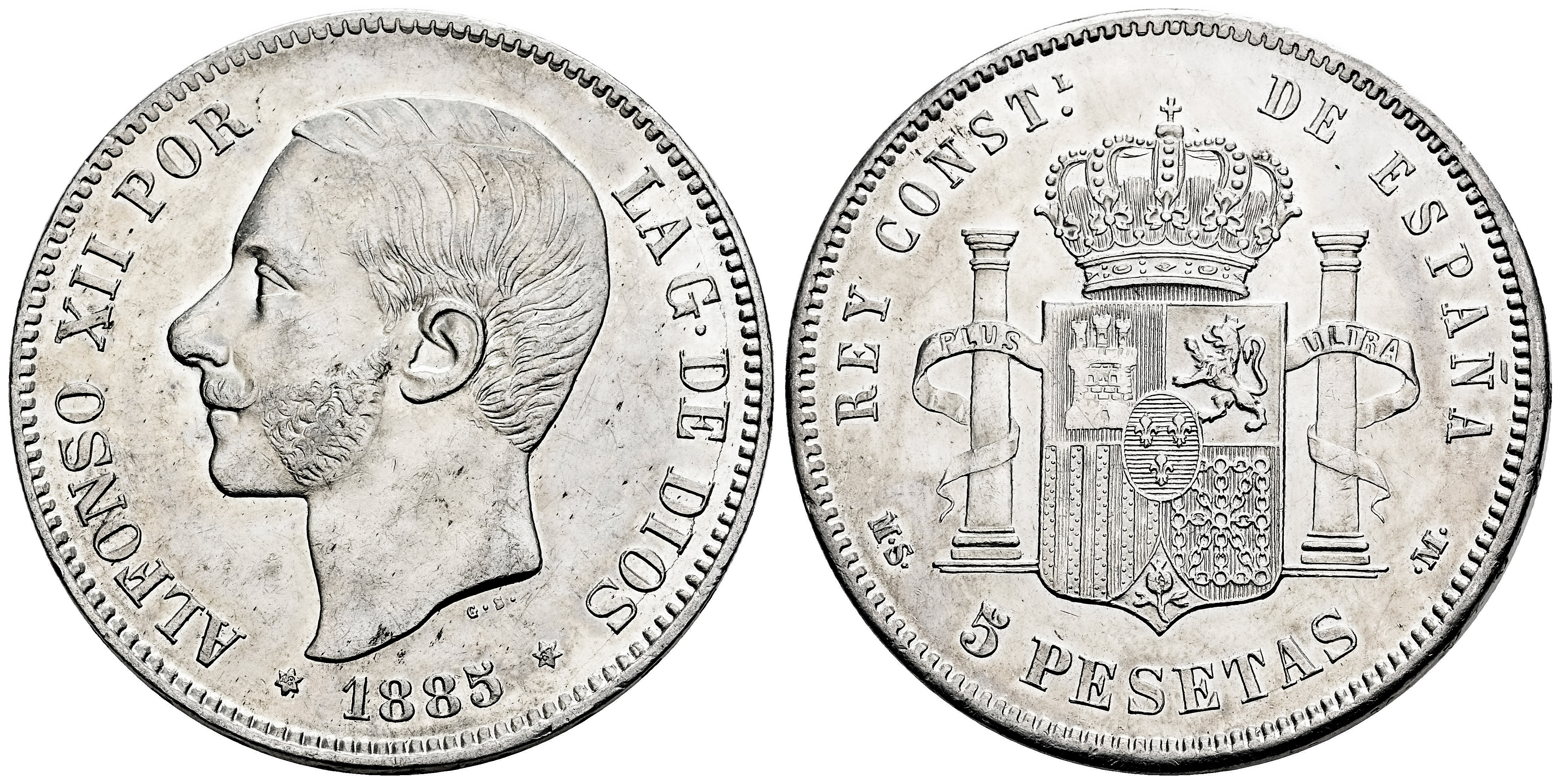 Centenario de la Peseta (1868-1931). Alfonso XII (1874-1885). 5 pesetas. 1885*18-87. Madrid. MSM. (Cal-62). Ag. 24,84 g. Ligeramente frotada. Restos de brillo original. MBC+. Est...90,00.