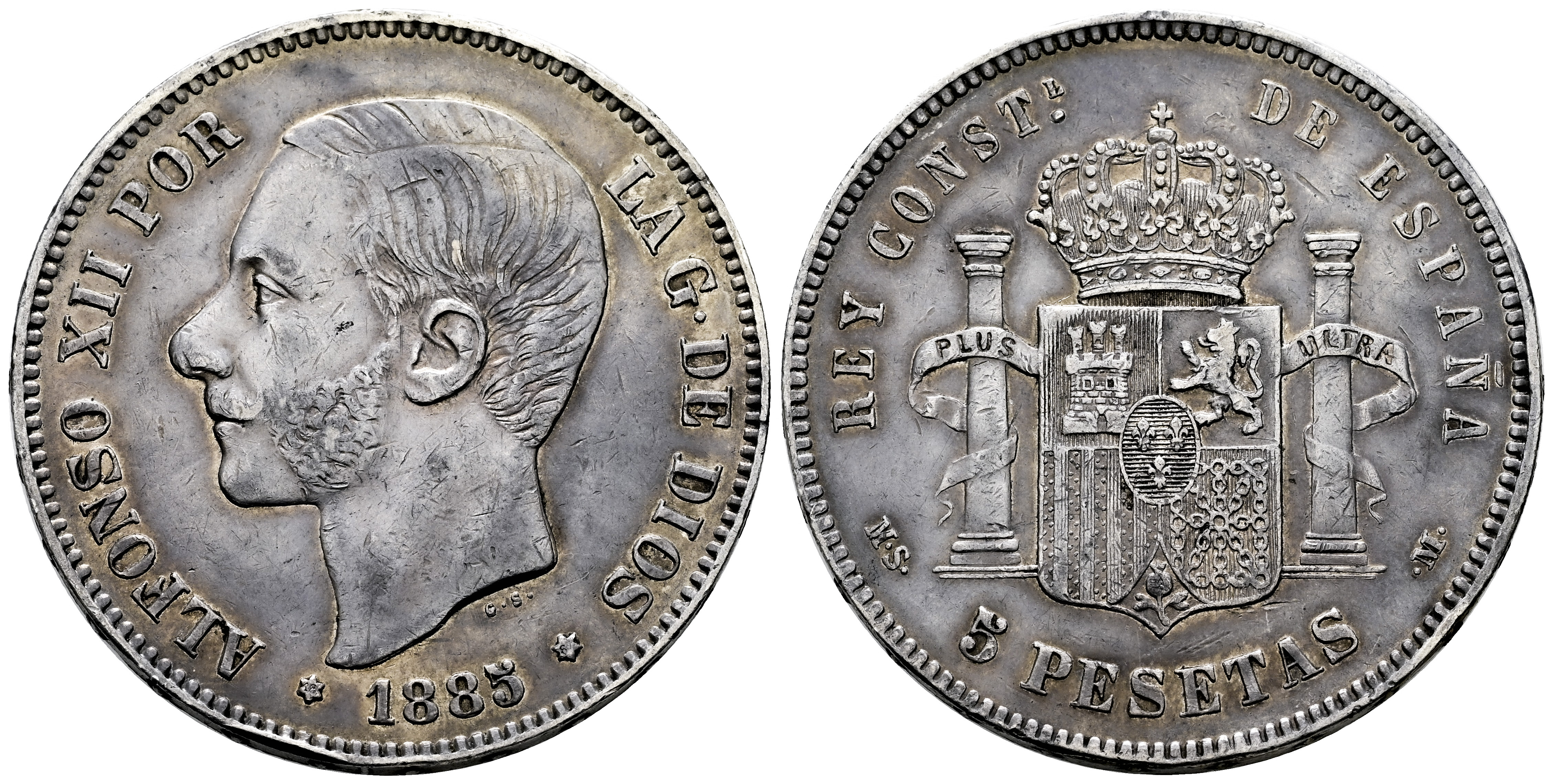 Centenario de la Peseta (1868-1931). Alfonso XII (1874-1885). 5 pesetas. 1885*18-87. Madrid. MSM. (Cal-62). Ag. 24,96 g. Segunda estrella tenue. Golpes en el canto. Ligera pátina. MBC. Est...50,00.