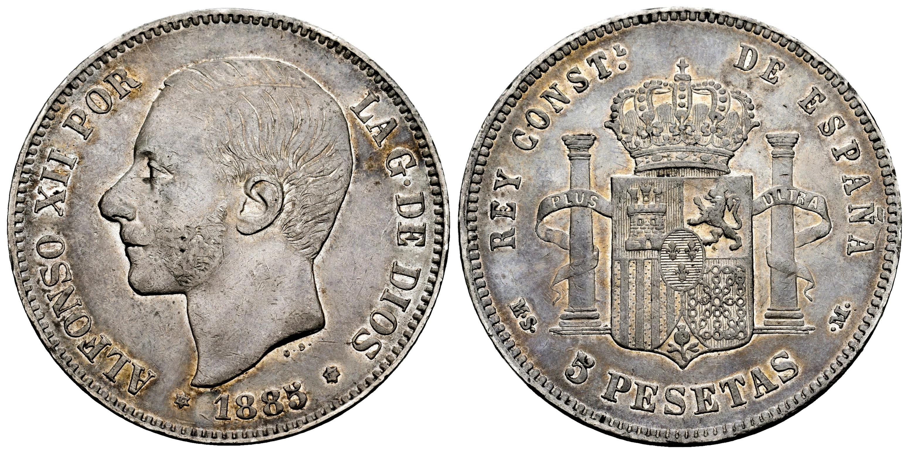Centenario de la Peseta (1868-1931). Alfonso XII (1874-1885). 5 pesetas. 1885*18-87. Madrid. MSM. (Cal-62). Ag. 24,82 g. Acuñada bajo el reinado de Alfonso XIII. Bonita pátina. Leves marquitas. MBC+. Est...70,00.