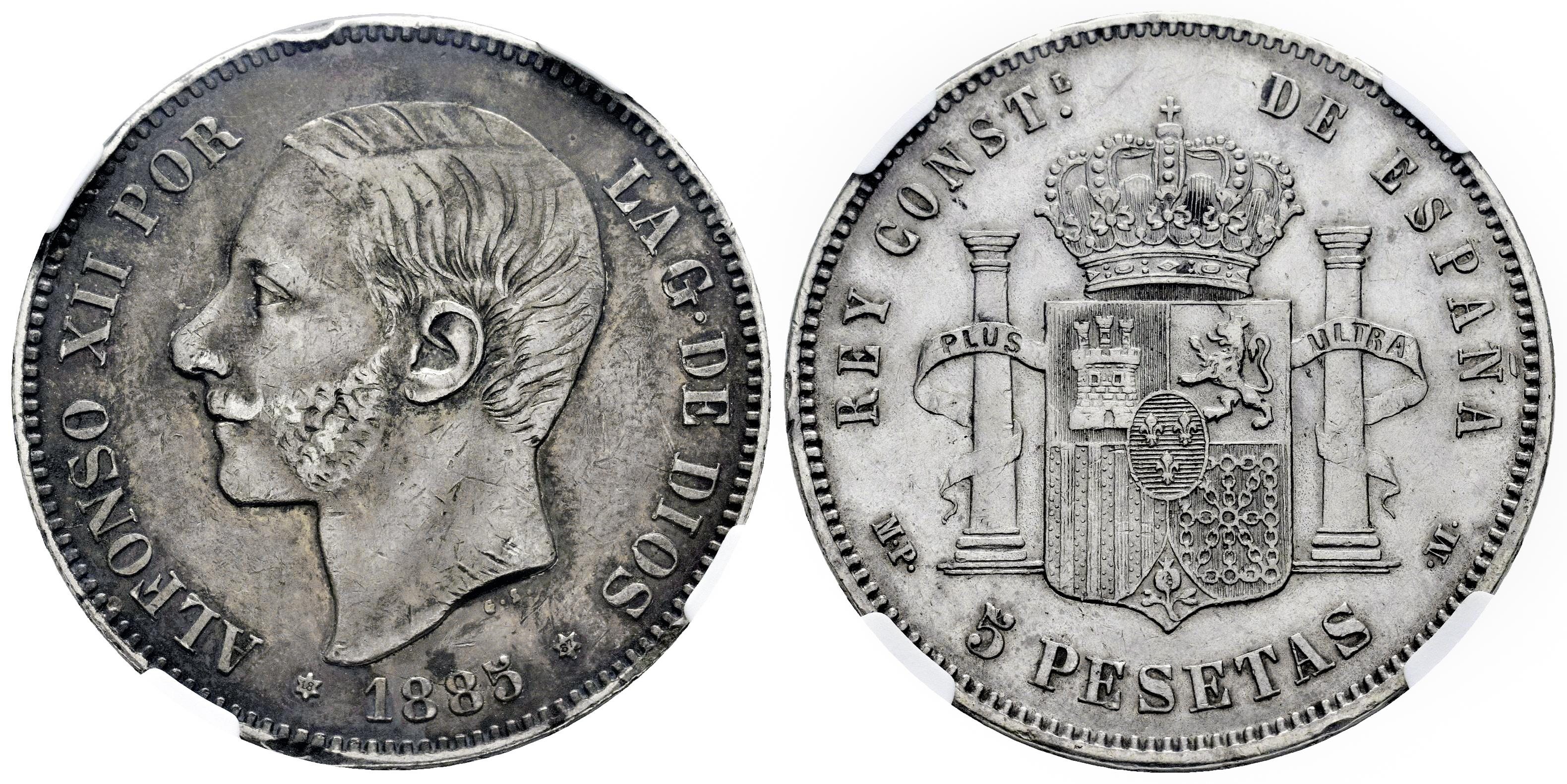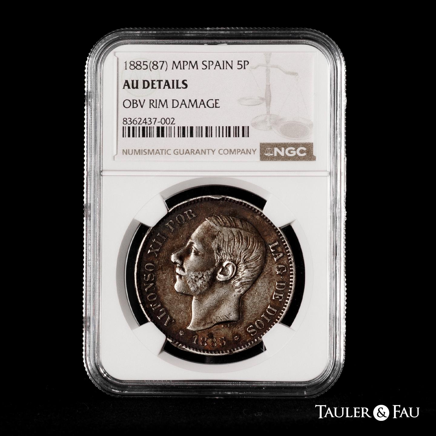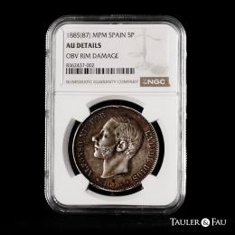 Centenario de la Peseta (1868-1931). Alfonso XII (1874-1885). 5 pesetas. 1885*18-87. Madrid. MPM. (Cal-63). Ag. Golpes en el canto. Encapsulada con NGC como AU Details, Obv. Rim damage. Est...50,00.