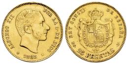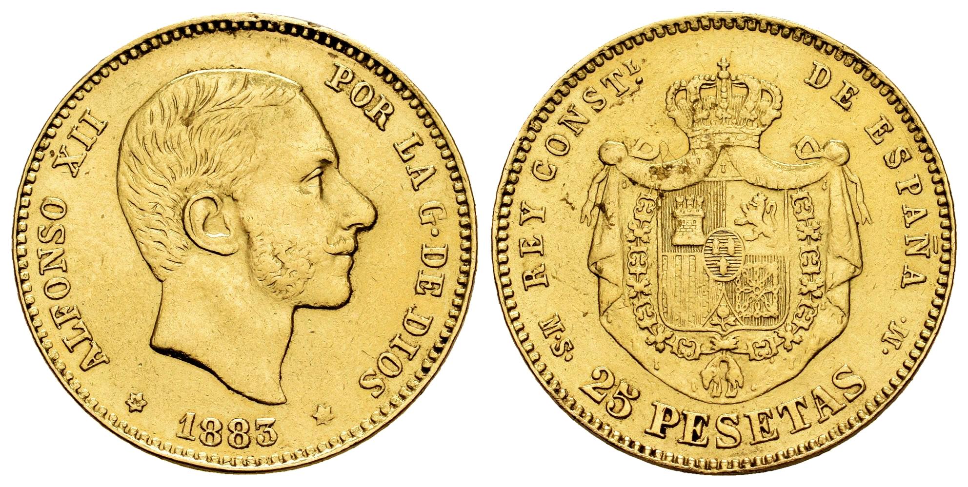 Centenario de la Peseta (1868-1931). Alfonso XII (1874-1885). 25 pesetas. 1883*18-_ _. Madrid. MSM. (Cal-87). Au. 8,05 g. Soldadura reparada en el canto a las 12 h. Limpiada. MBC+/MBC. Est...700,00.