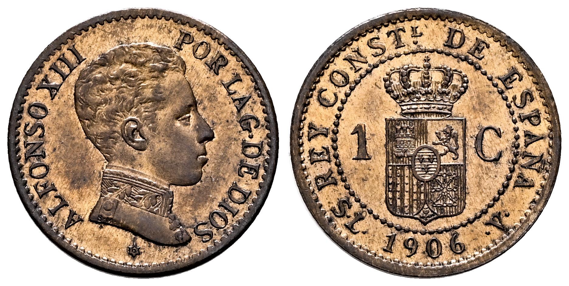 Centenario de la Peseta (1868-1931). Alfonso XIII (1886-1931). 1 céntimo. 1906*6. Madrid. SLV. (Cal-2). Ae. 0,86 g. Brillo original. EBC+. Est...25,00.