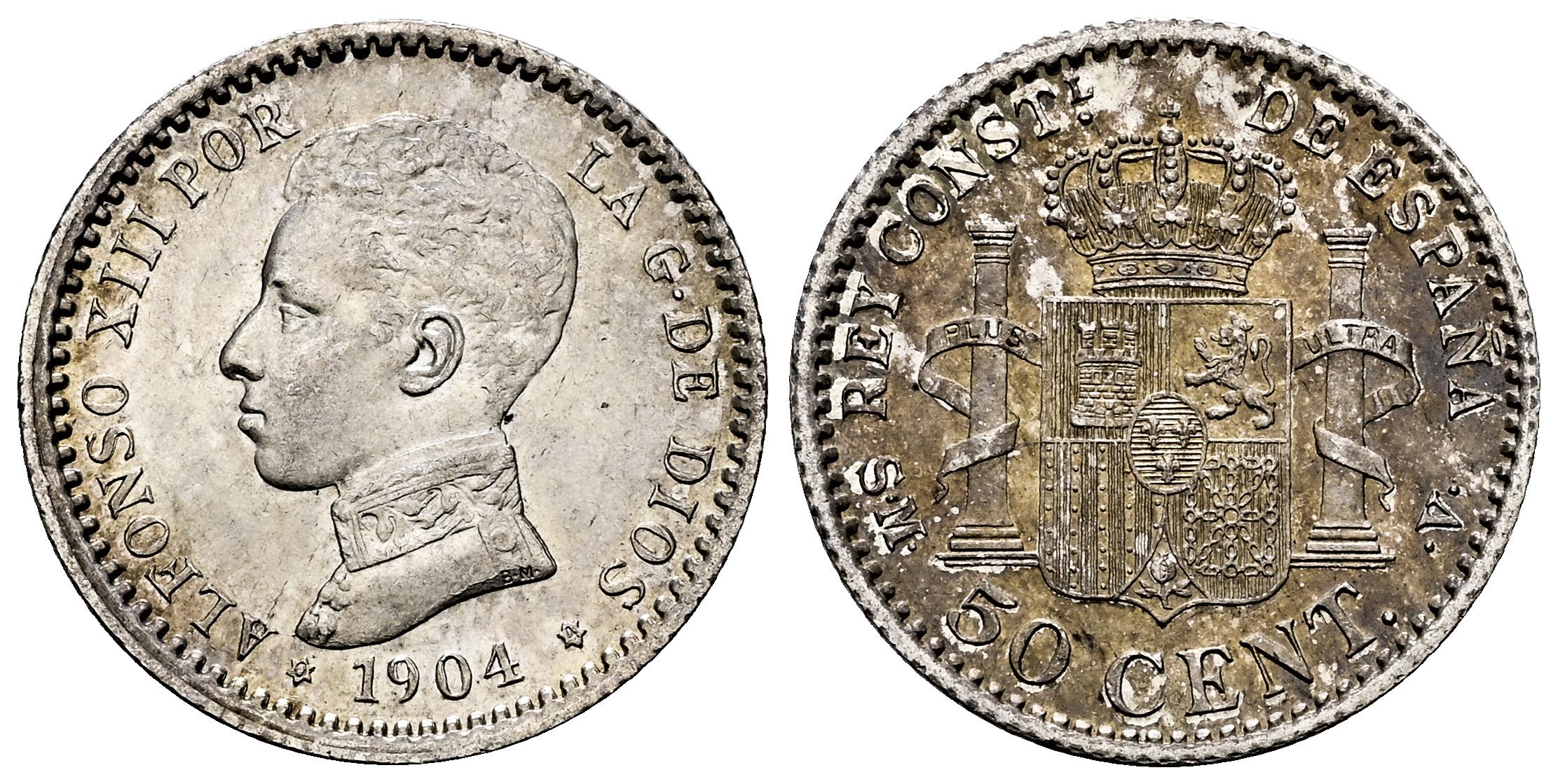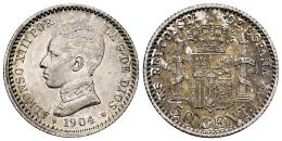 Centenario de la Peseta (1868-1931). Alfonso XIII (1886-1931). 50 céntimos. 1904*0-4. Madrid. SMV. (Cal-46). Ag. 2,53 g. Ligero tono en reverso. Restos de brillo original. EBC. Est...30,00.