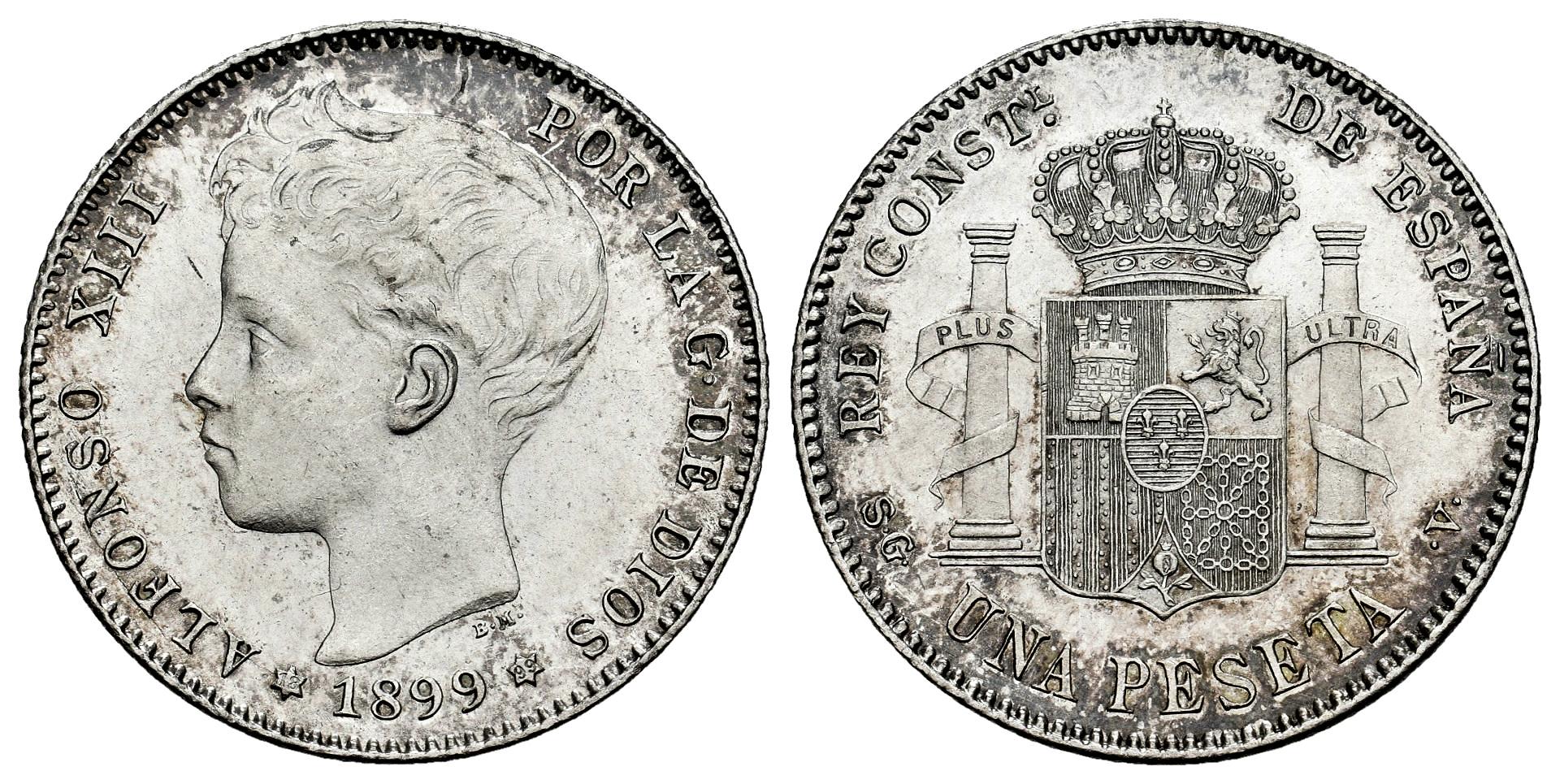Centenario de la Peseta (1868-1931). Alfonso XIII (1886-1931). 1 peseta. 1899*18-99. Madrid. SGV. (Cal-75). Ag. 4,97 g. Pleno brillo original. SC-. Est...110,00.