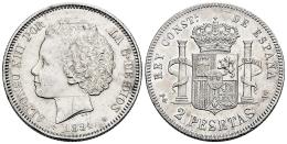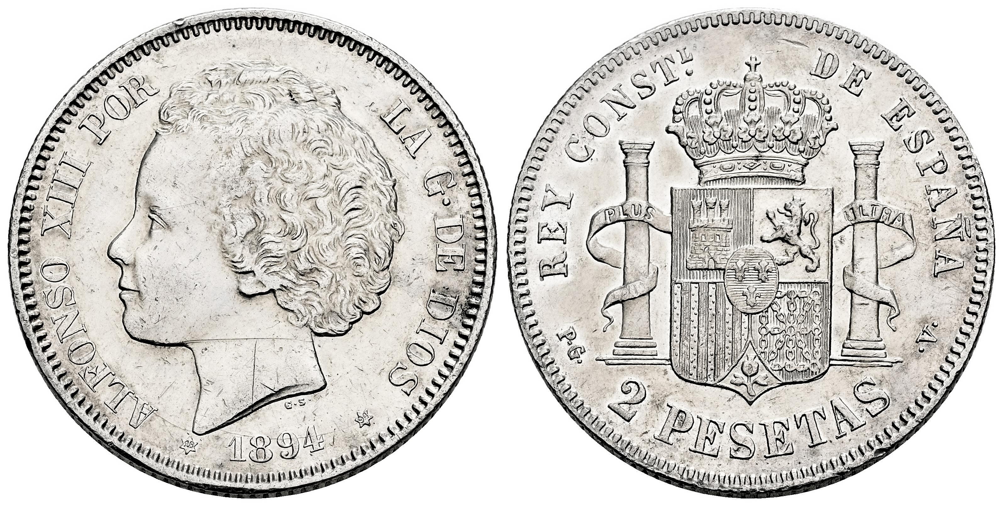 Centenario de la Peseta (1868-1931). Alfonso XIII (1886-1931). 2 pesetas. 1894*18-94. Madrid. PGV. (Cal-86). Ag. 10,00 g. Limpiada. Rayas en anverso y golpecitos en el canto. EBC-. Est...140,00.