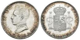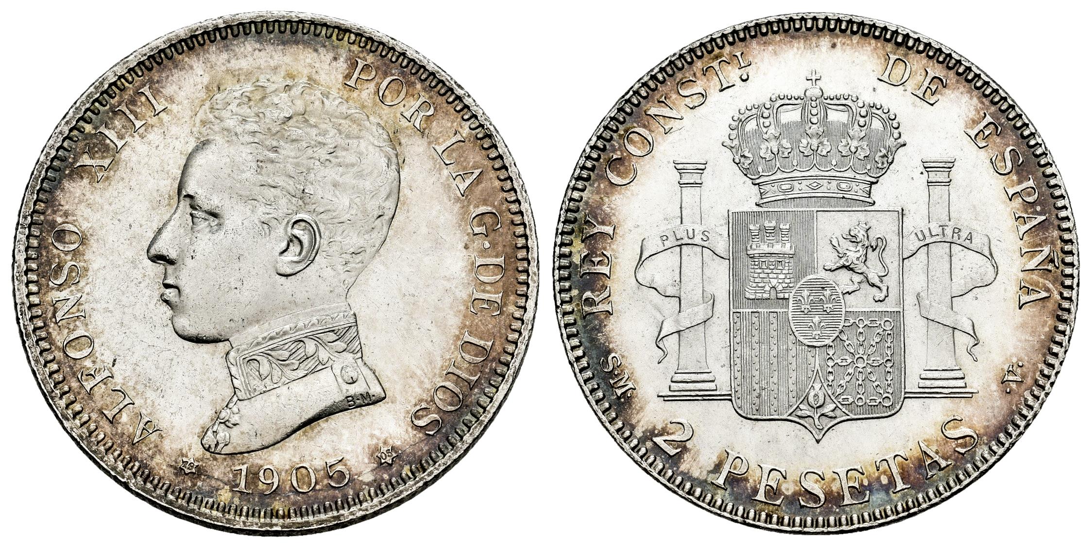 Centenario de la Peseta (1868-1931). Alfonso XIII (1886-1931). 2 pesetas. 1905*19-05. Madrid. SMV. (Cal-88). Ag. 9,98 g. Suaves rayitas en el anverso. Brillo original. EBC+. Est...50,00.