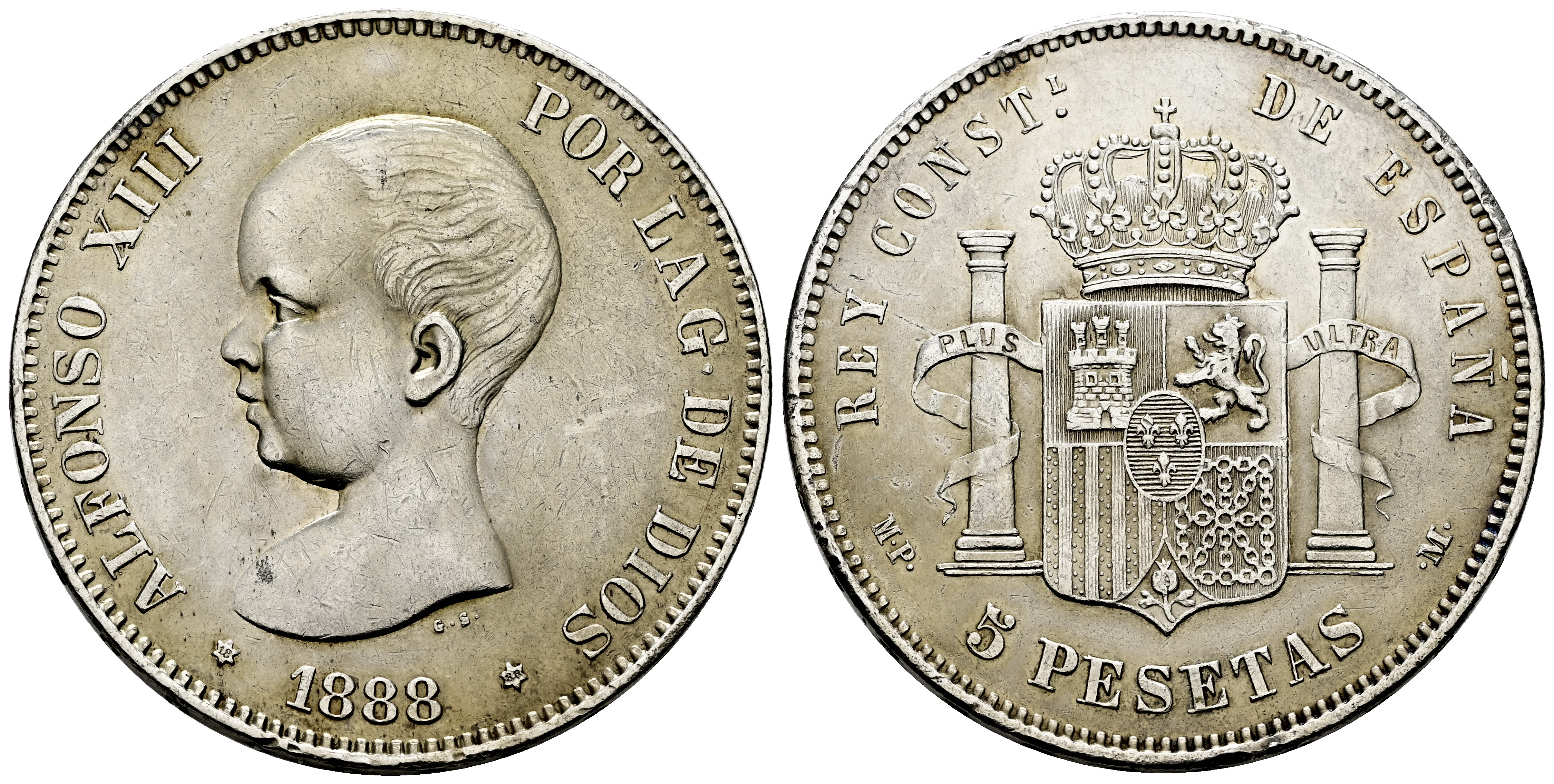 Centenario de la Peseta (1868-1931). Alfonso XIII (1886-1931). 5 pesetas. 1888*18-88. Madrid. MPM. (Cal-92). Ag. 24,91 g. Leves marcas y golpes en el canto. Limpiada. MBC+. Est...60,00.