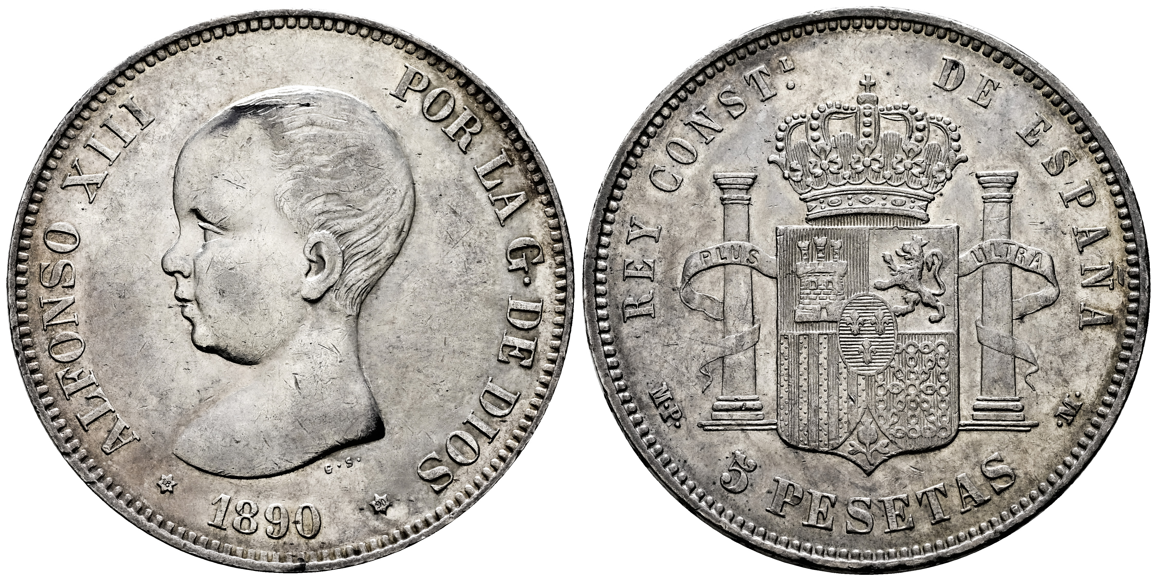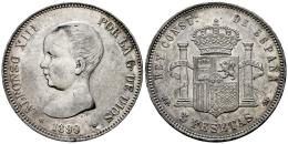 Centenario de la Peseta (1868-1931). Alfonso XIII (1886-1931). 5 pesetas. 1890*18-90. Madrid. MPM. (Cal-95). Ag. 25,05 g. Leves marquitas. Restos de brillo original. MBC+/EBC-. Est...70,00.