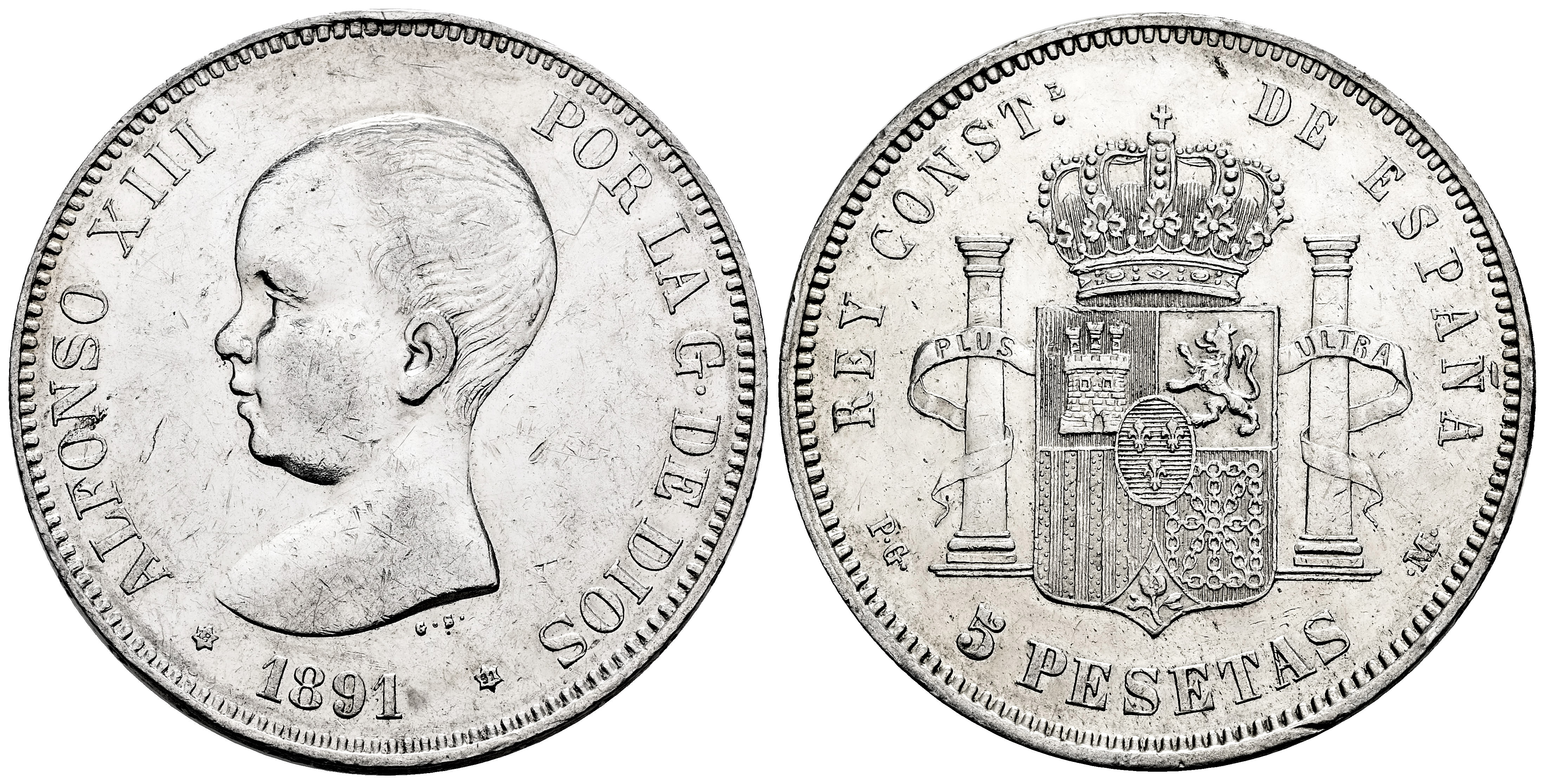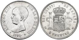 Centenario de la Peseta (1868-1931). Alfonso XIII (1886-1931). 5 pesetas. 1891*18-91. Madrid. PGM. (Cal-98). Ag. 24,97 g. Golpe en el canto y pequeñas marcas. Limpiada. MBC/MBC+. Est...70,00.