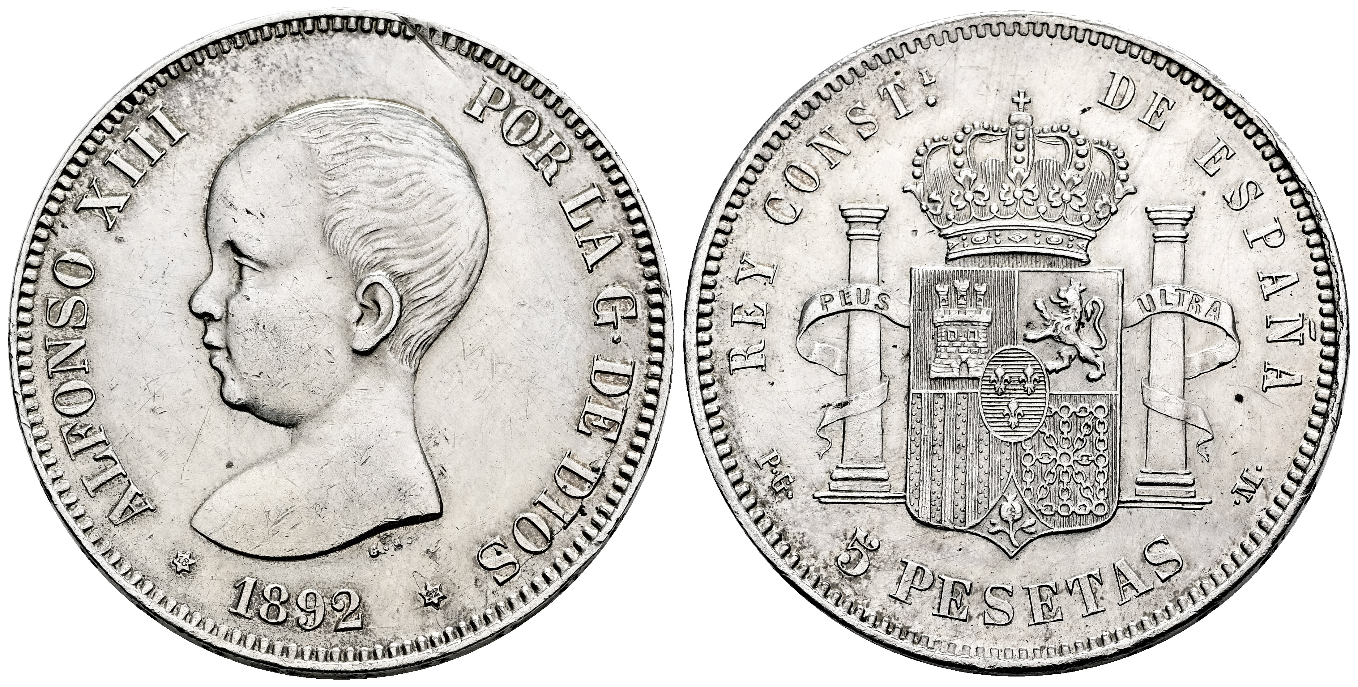 Centenario de la Peseta (1868-1931). Alfonso XIII (1886-1931). 5 pesetas. 1892*18-92. Madrid. PGM. (Cal-99). Ag. 24,86 g. Ligeramente limpiada. EBC-/EBC. Est...180,00.