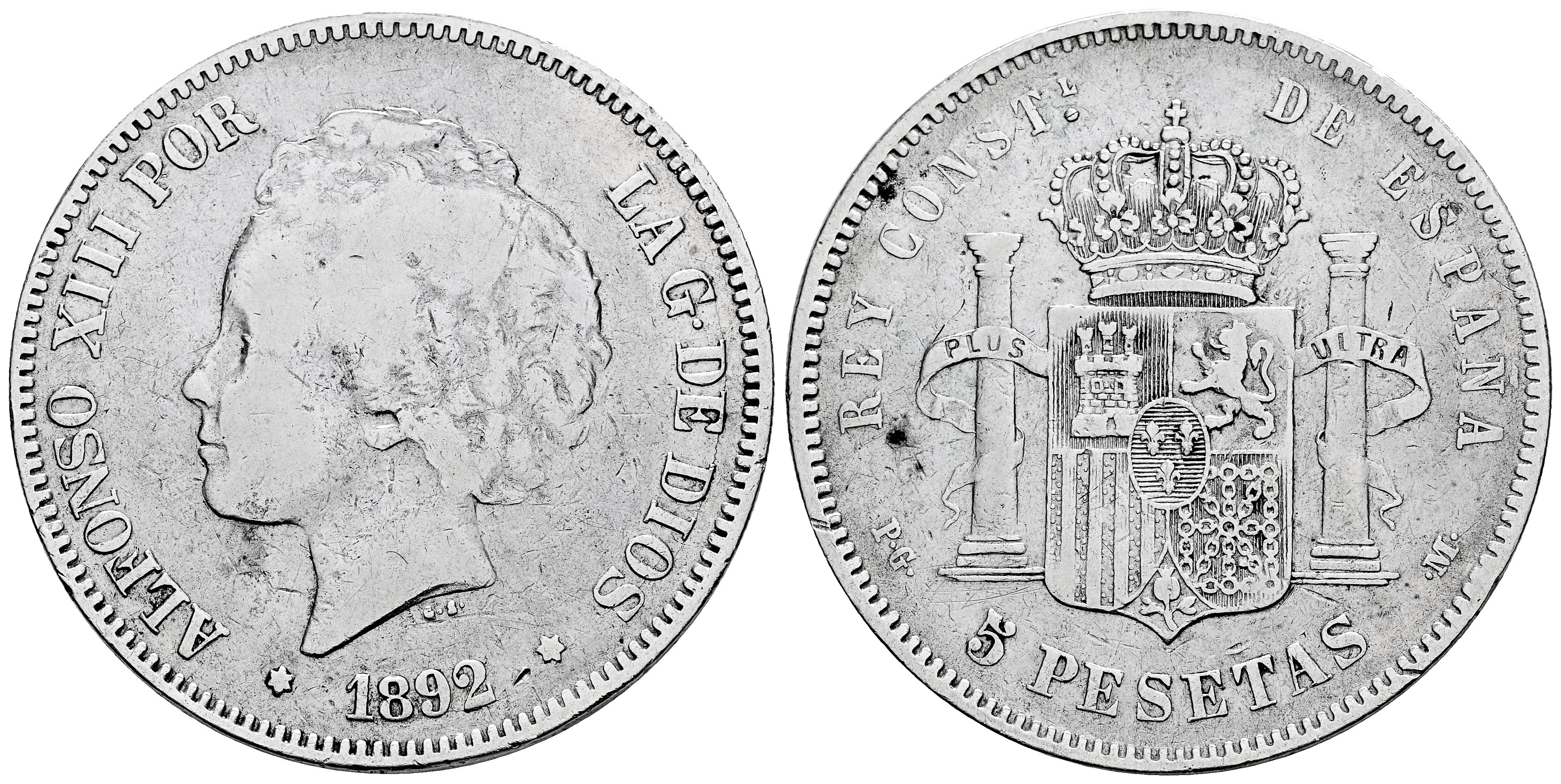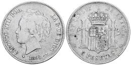 Centenario de la Peseta (1868-1931). Alfonso XIII (1886-1931). 5 pesetas. 1892*_ _-_ _. Madrid. PGM. (Cal-100). Ag. 24,38 g. Estrellas no visibles. BC. Est...50,00.