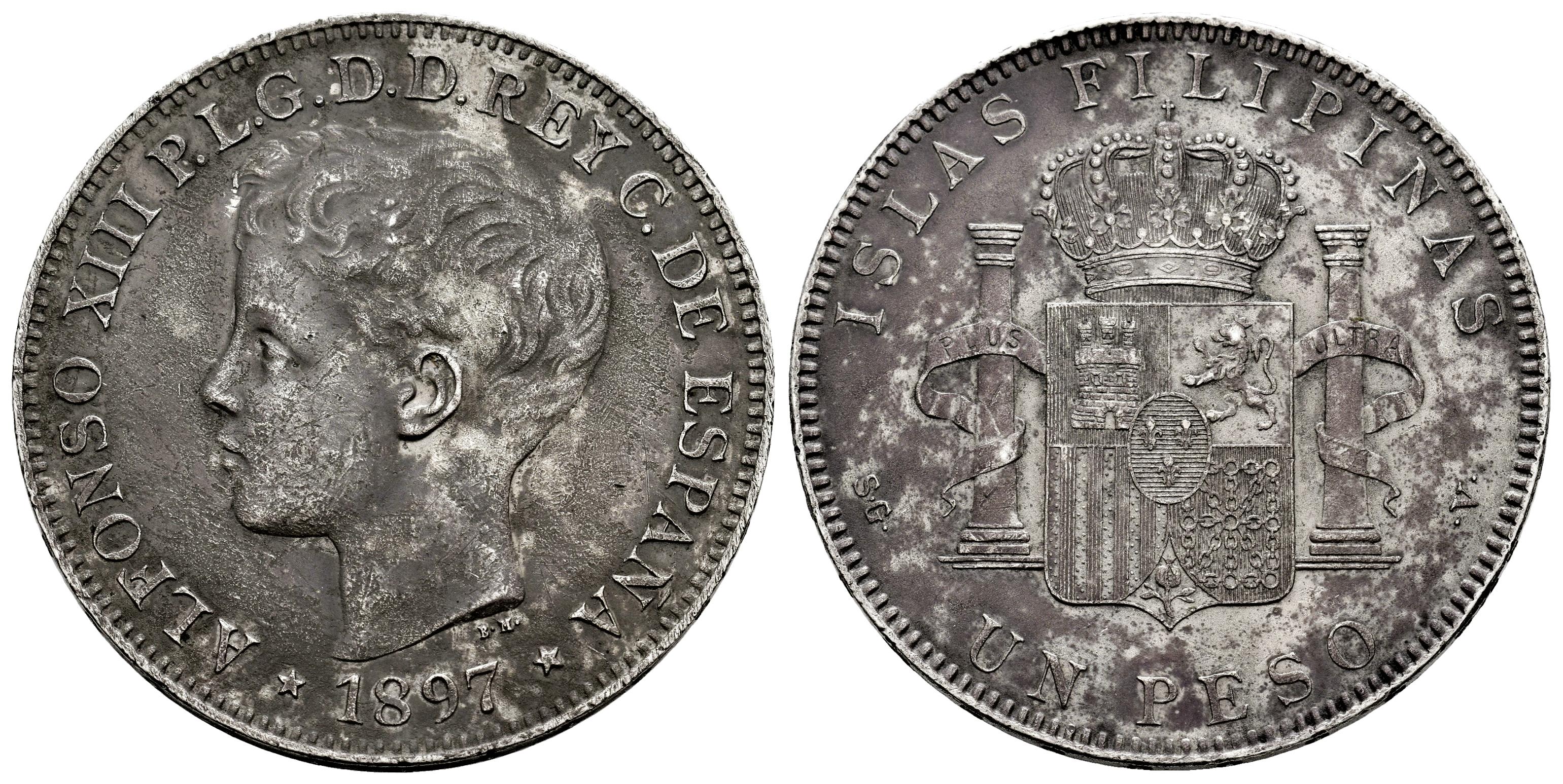 Centenario de la Peseta (1868-1931). Alfonso XIII (1886-1931). 1 peso. 1897. Manila. (Cal-122). Ag. 24,63 g. Pátina irregular con ligero tono. Porosidades en el metal. MBC+. Est...160,00.