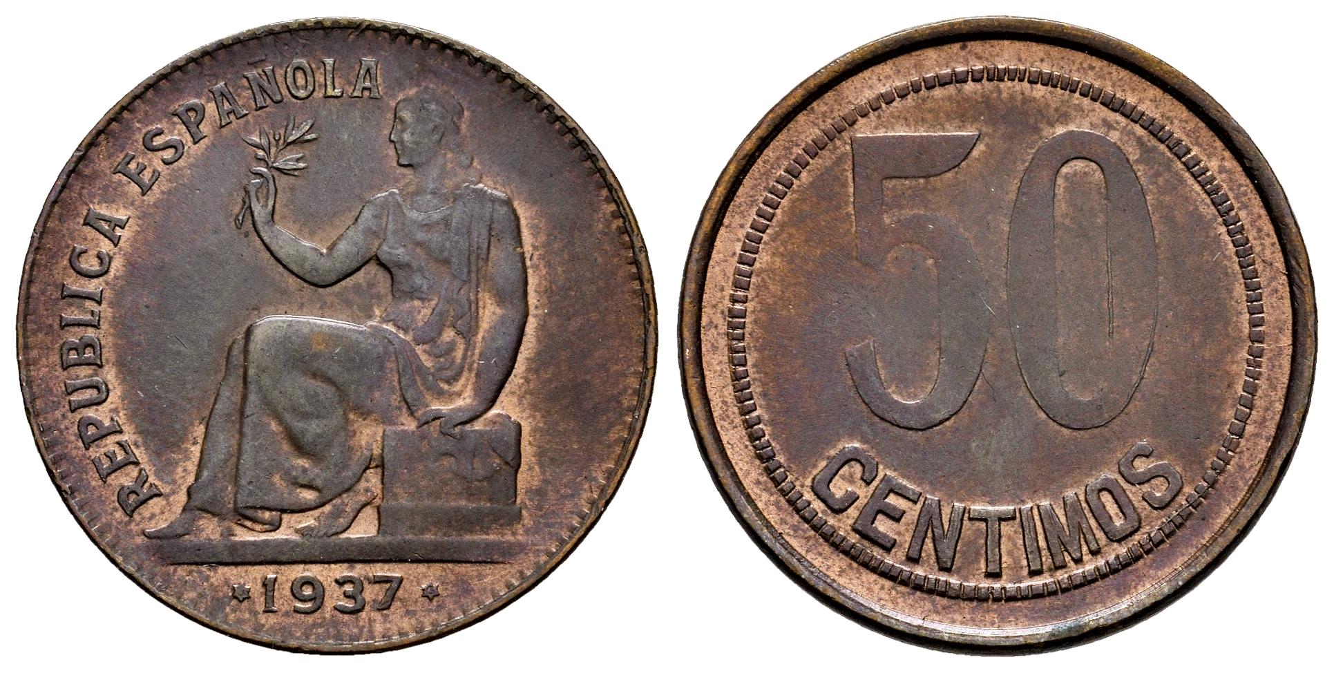 II República (1931-1939). 50 céntimos. 1937. Madrid. (Cal-28). Ae. 5,98 g. Orla de cuadraditos. Restos de brillo original. EBC/EBC-. Est...25,00.