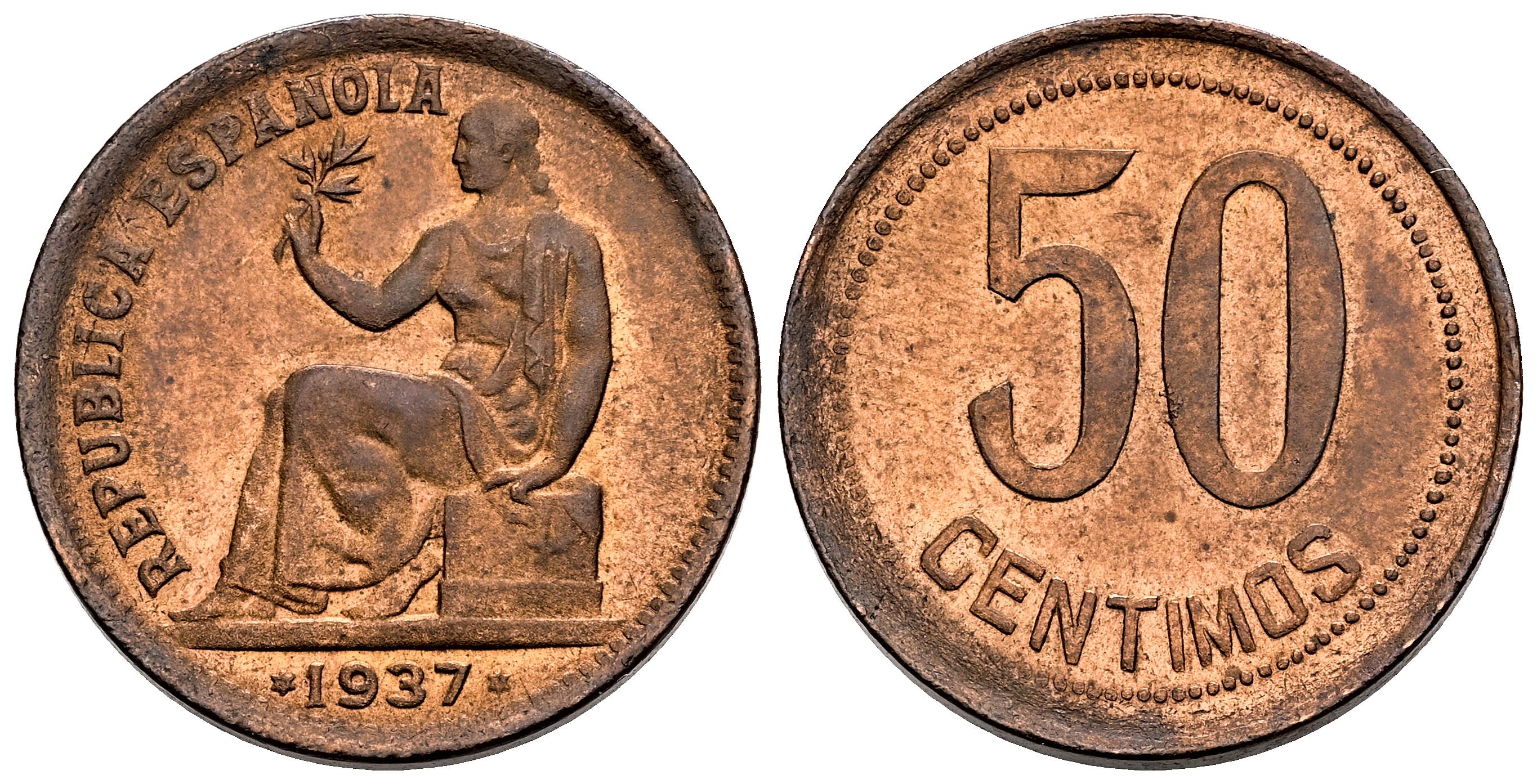 II República (1931-1939). 50 céntimos. 1937*3-4. Madrid. (Cal-29). Ae. 5,82 g. Estrellas muy tenues. Restos de brillo original. EBC. Est...30,00.