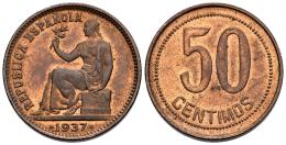 II República (1931-1939). 50 céntimos. 1937*3-4. Madrid. (Cal-29). Ae. 6,48 g. Estrellas muy tenues. Brillo original. EBC. Est...30,00.