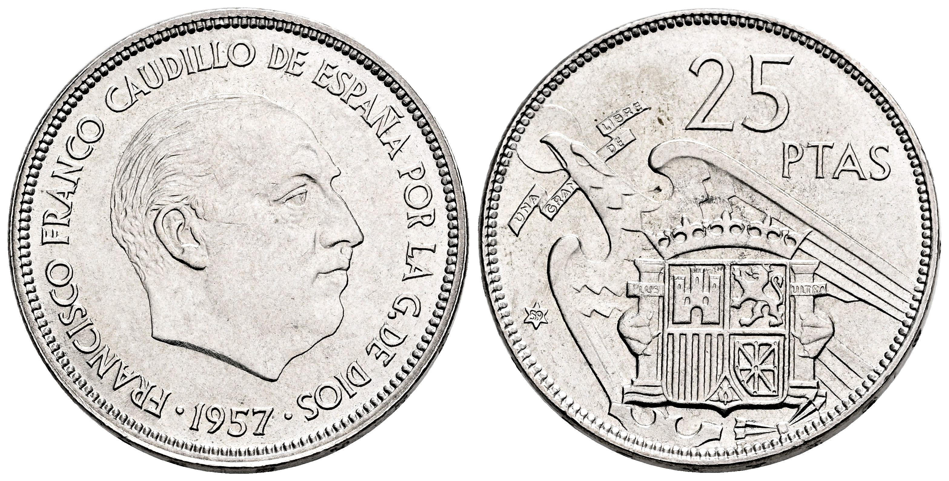 Estado Español (1936-1975). 25 pesetas. 1957*59. Madrid. (Cal-117). Ni. 8,49 g. Brillo original. SC. Est...25,00.