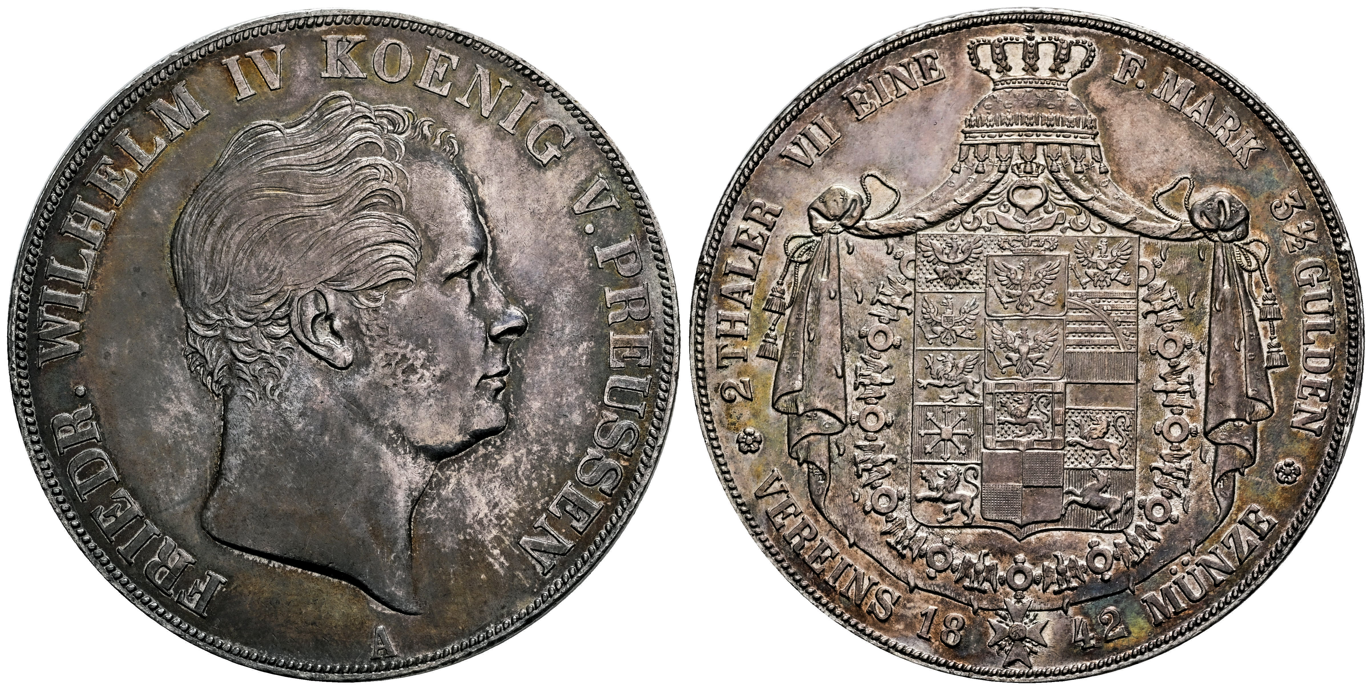 Alemania. Prussia. Friedrich Wilhelm IV. Doppeltaler. 1842. Berlín. A. (Jaeger-71). (AKS-69). (Kahnt-381). Ag. 37,08 g. Precioso tono con brillo original subyacente. Muy bella. EBC. Est...200,00.