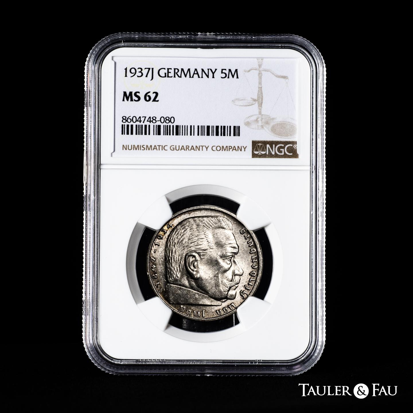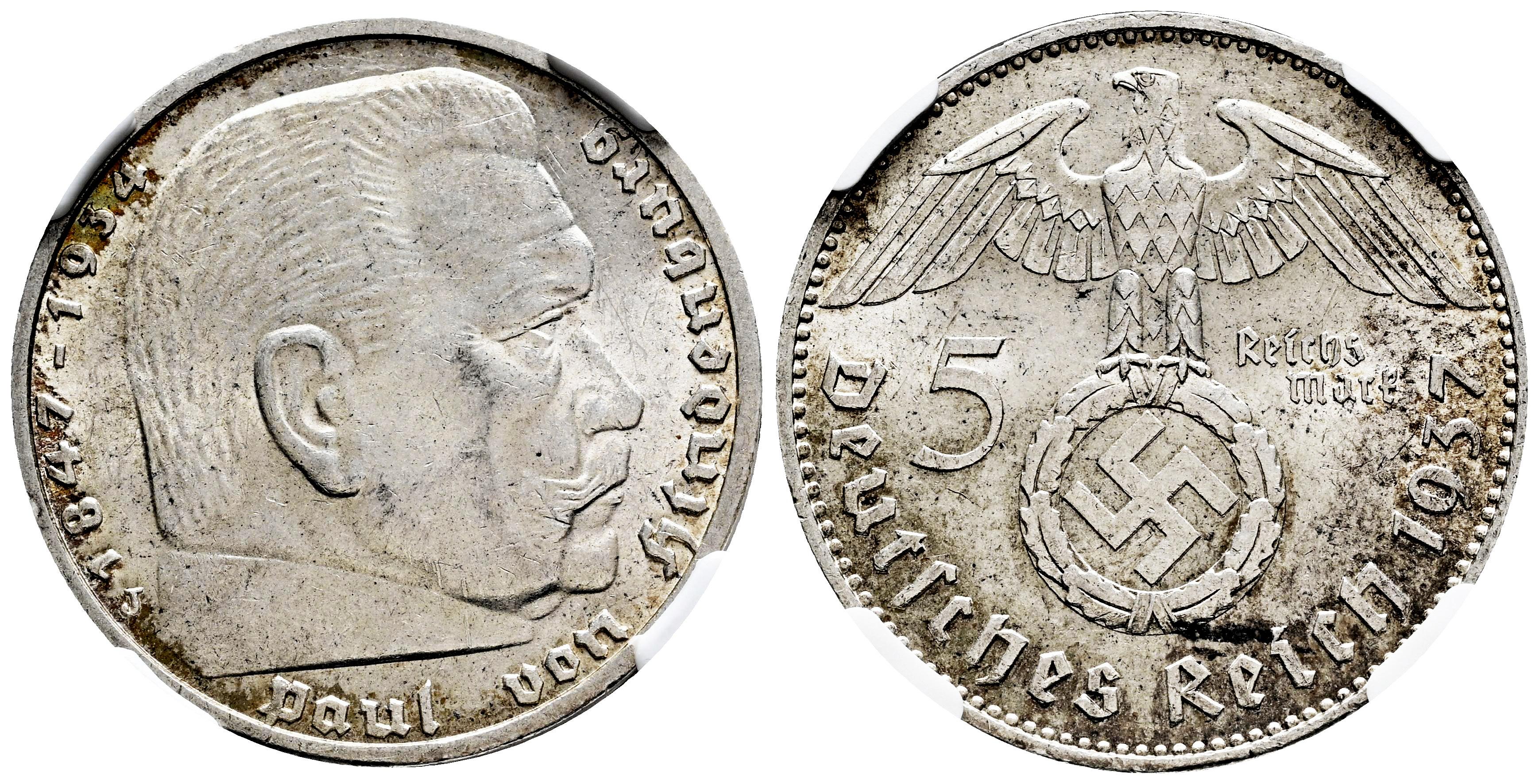 Alemania. Third Reich. 5 reichsmark. 1937. Hamburgo. J. (Km-94). Ag. Encapsulada por NGC como MS 62. Est...70,00.