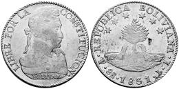 Bolivia. 8 soles. 1831. Potosí. JL. (Km-97). Ag. 27,00 g. Acuñación floja. Hojitas. Restos de brillo original. MBC/MBC+. Est...90,00.