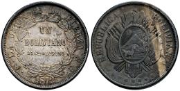 Bolivia. 1 boliviano. 1872. Potosí. FE. (Km-160.1). Ag. 24,48 g. Pátina. MBC+/MBC-. Est...60,00.