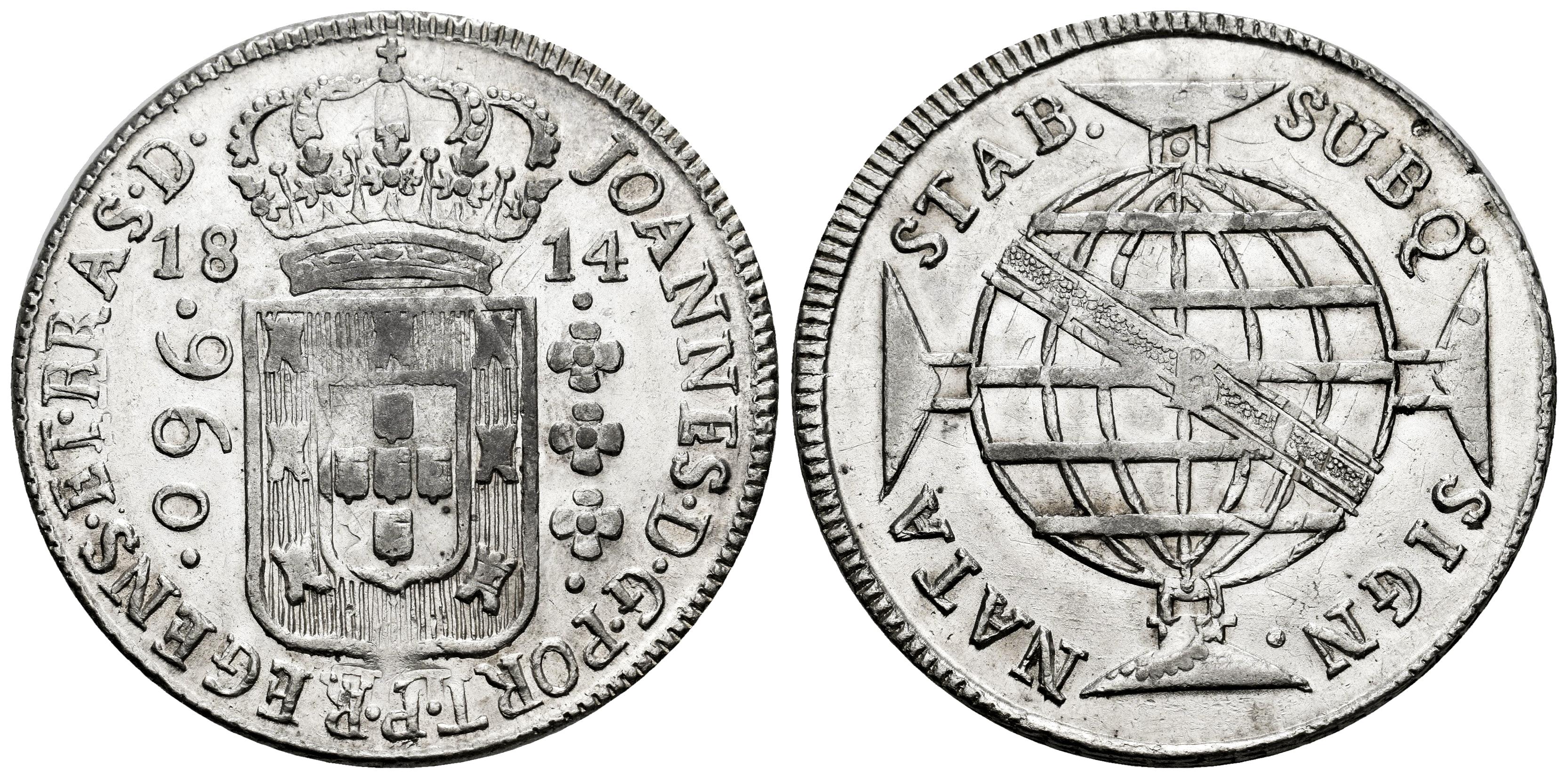 Brasil. D. Joao, Príncipe Regente (1799-1816). 960 reis. 1814. Bahía. B. (Km-307.1). Ag. 26,86 g. Restos de brillo original. EBC-. Est...150,00.