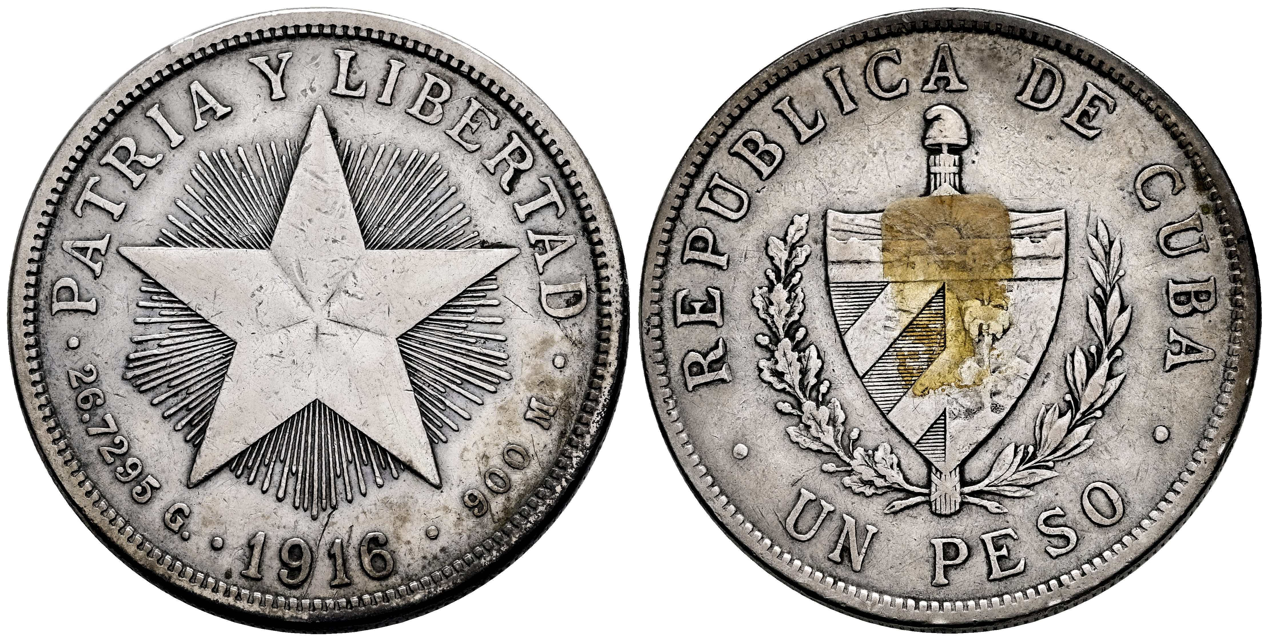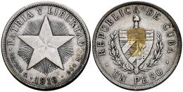 Cuba. 1 peso. 1916. (Km-15.2). Ag. 26,48 g. Restos de adhesivo en reverso. Marquitas. Limpiada. MBC. Est...35,00.