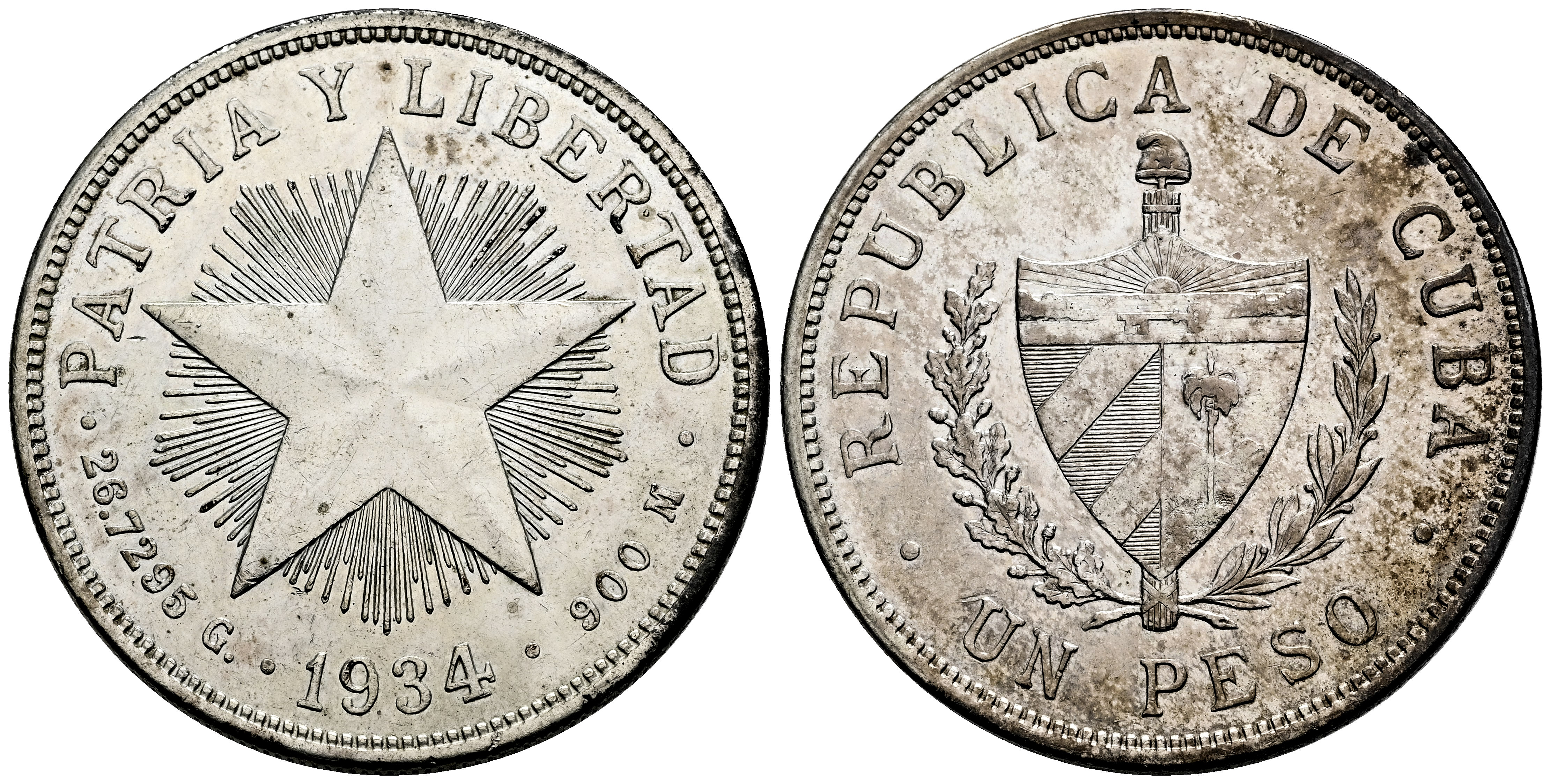 Cuba. 1 peso. 1934. Philadelphia. (Km-15.2). Ag. 26,76 g. Marquitas. Limpiada. EBC-. Est...60,00.