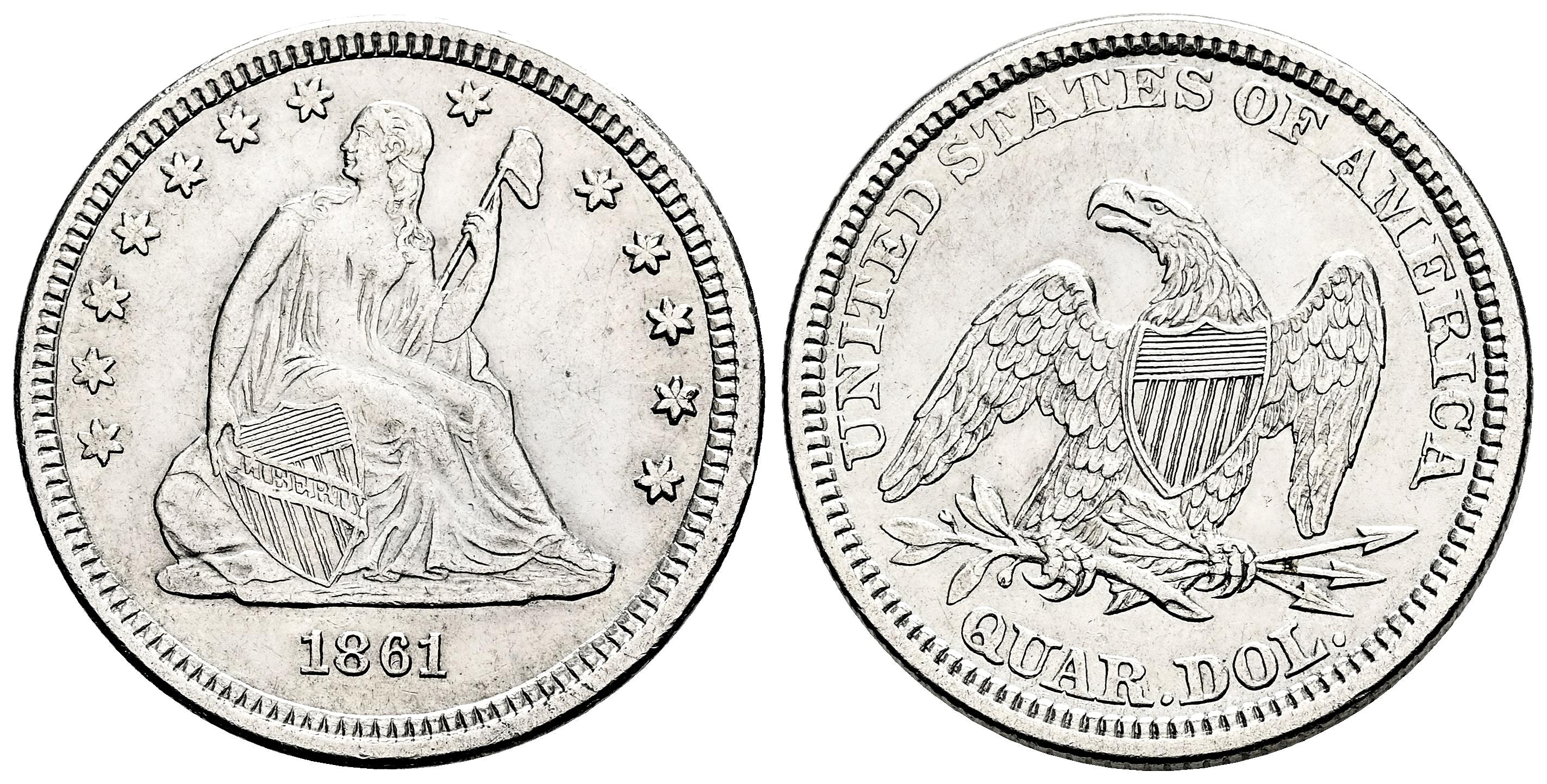Estados Unidos. Seated Liberty Quarters. 1/4 dollar. 1861. Philadelphia. (Km-A64.2). Ag. 6,18 g. Ex Tauler & Fau 91 (14/09/2021), lote 93. MBC+. Est...80,00.