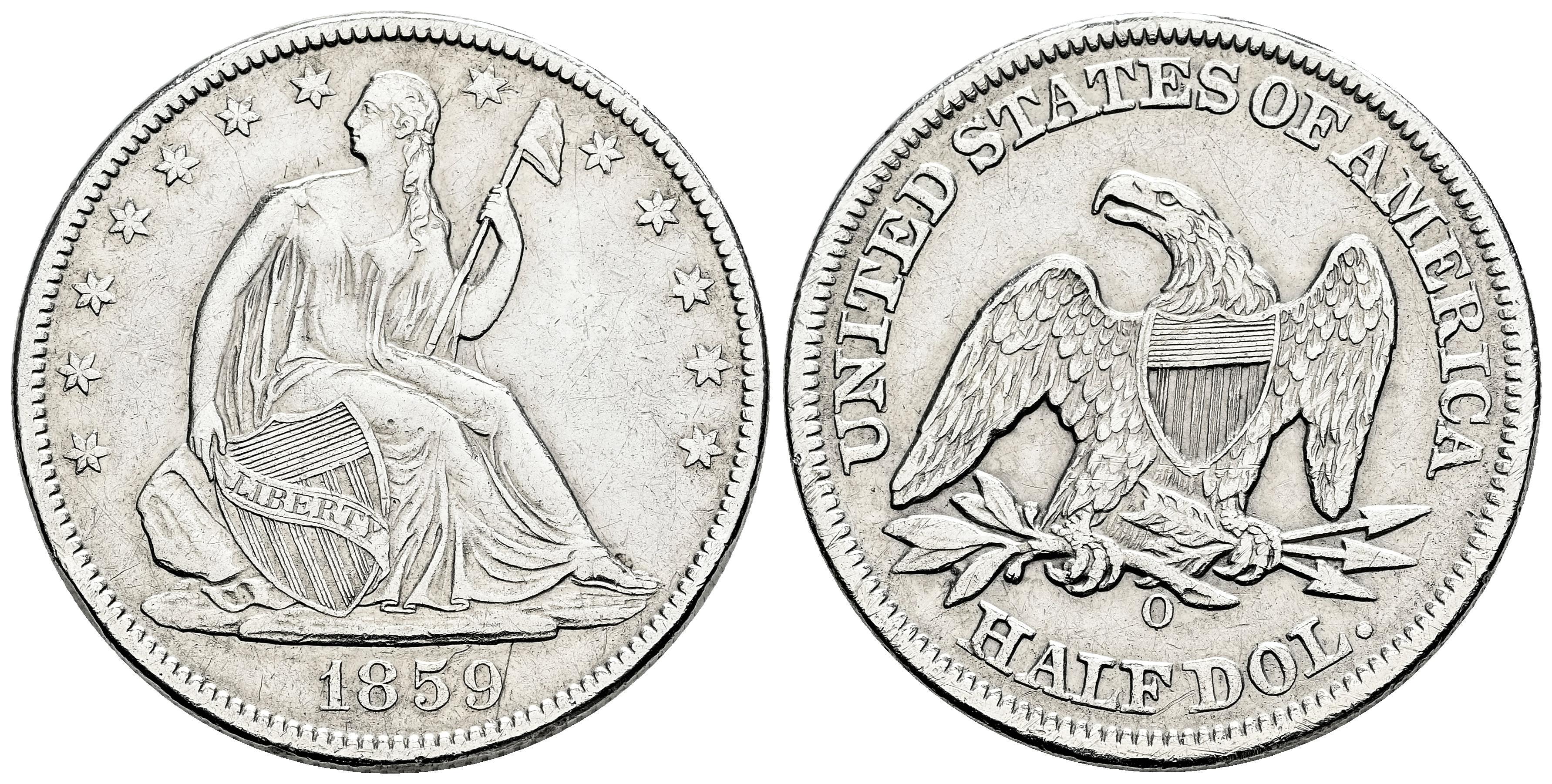 Estados Unidos. Seated Liberty Half Dollars. 1/2 dollar. 1859. Nueva Orleans. O. (Km-A68). Ag. 12,29 g. Limpiada. Golpe en el canto. MBC+. Est...60,00.