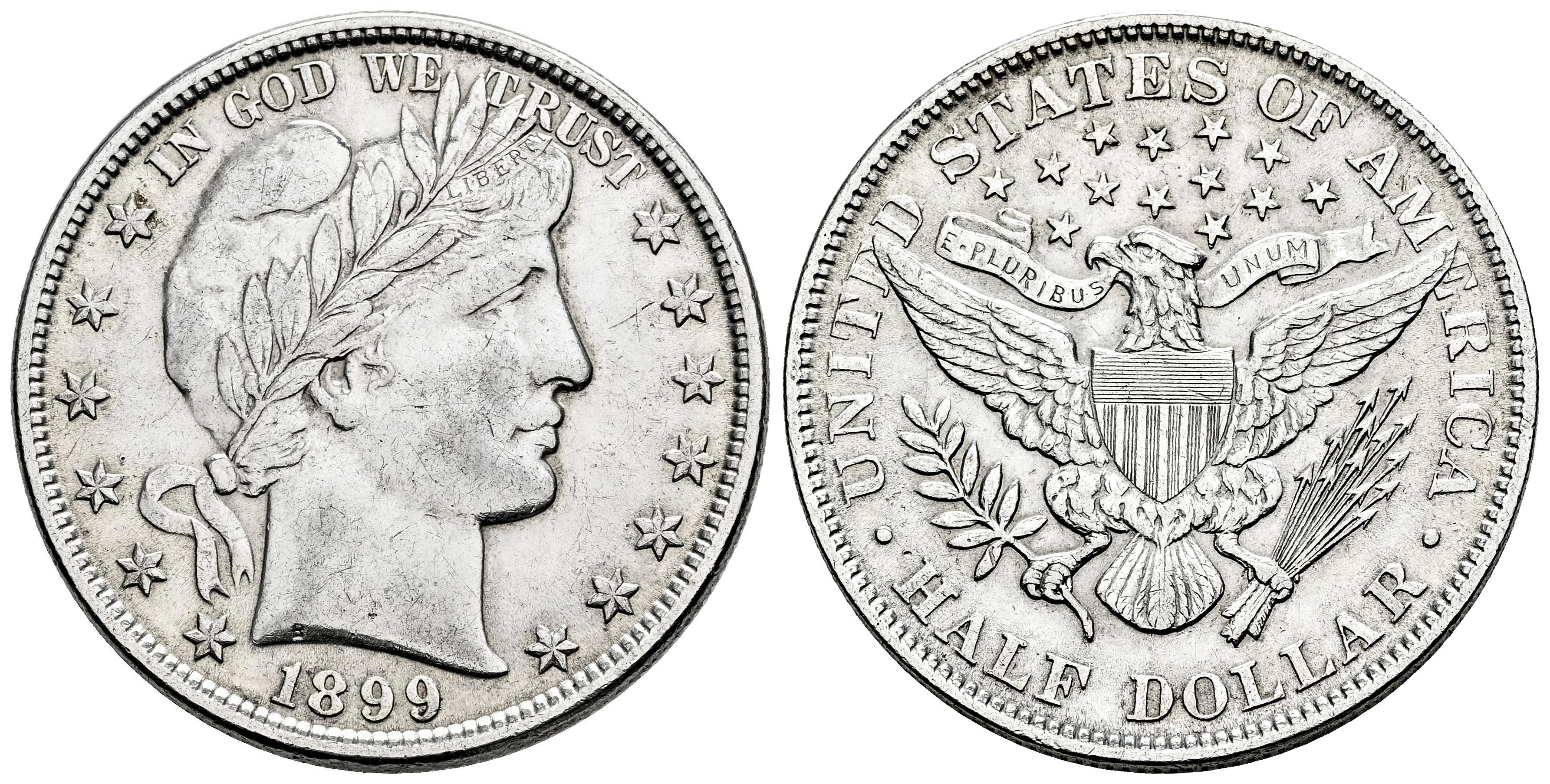 Estados Unidos. Barber Half Dollar. 1/2 dollar. 1899. Philadelphia. (Km-116). Ag. 12,37 g. Limpiada. Ex Tauler & Fau 62 (08/07/2020), lote 2330. EBC-. Est...200,00.