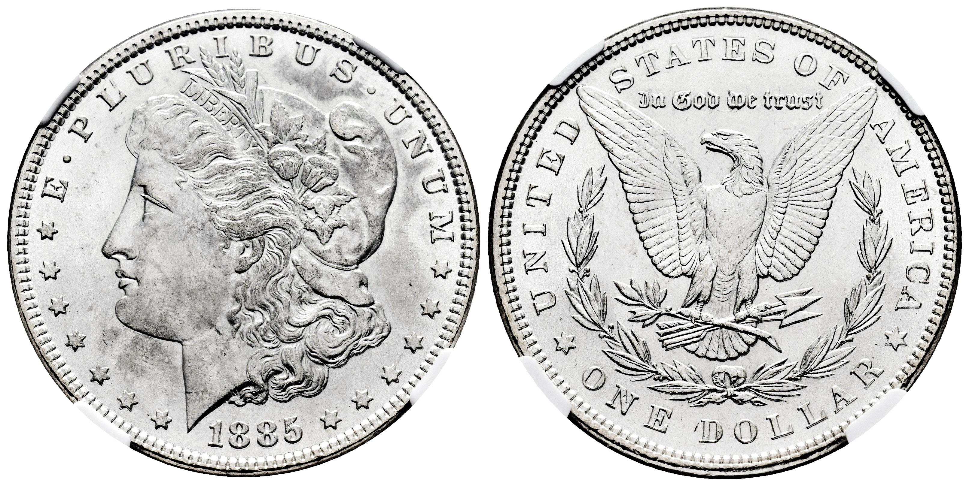 Estados Unidos. Morgan Dollars. 1 dollar. 1885. Philadelphia. (Km-110). Ag. Pleno brillo original. Encapsulada por NGC como MS 63. NGC-MS. Est...150,00.