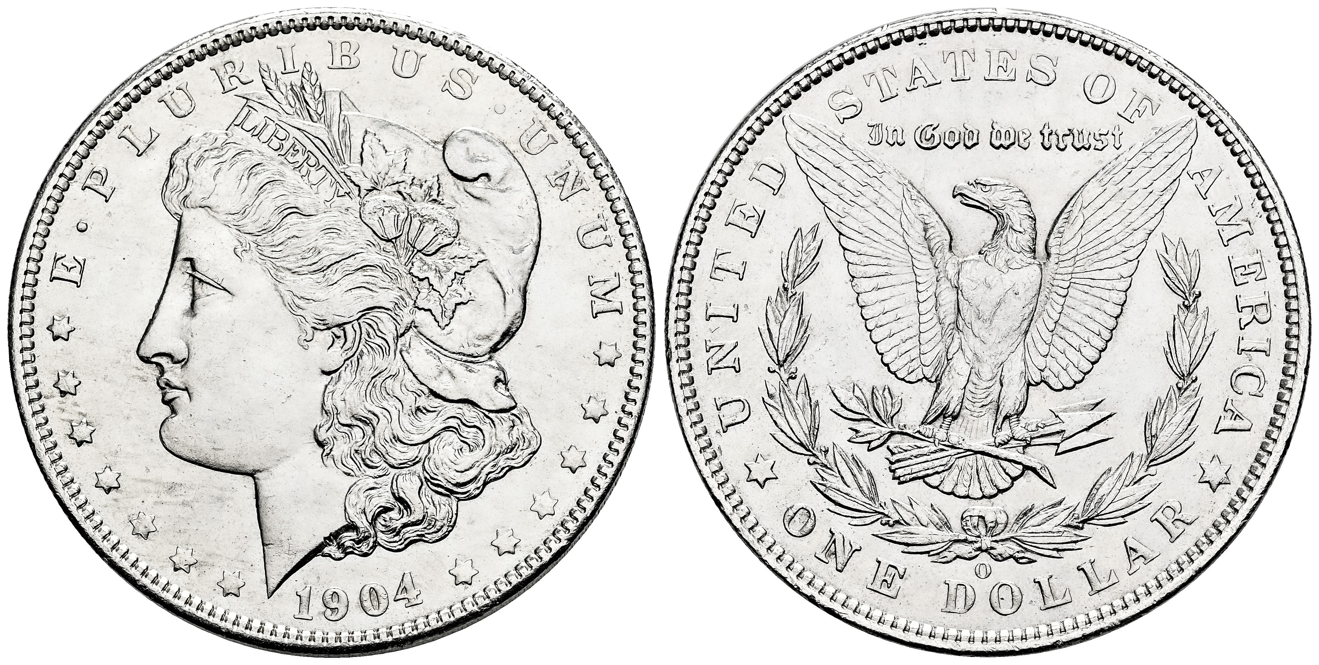 Estados Unidos. Morgan Dollars. 1 dollar. 1904. Nueva Orleans. O. (Km-110). Ag. 26,74 g. Restos de brillo original. Ligeramente limpiada. Ex Tauler & Fau 91 (14/09/2021), lote 99. EBC+. Est...85,00.
