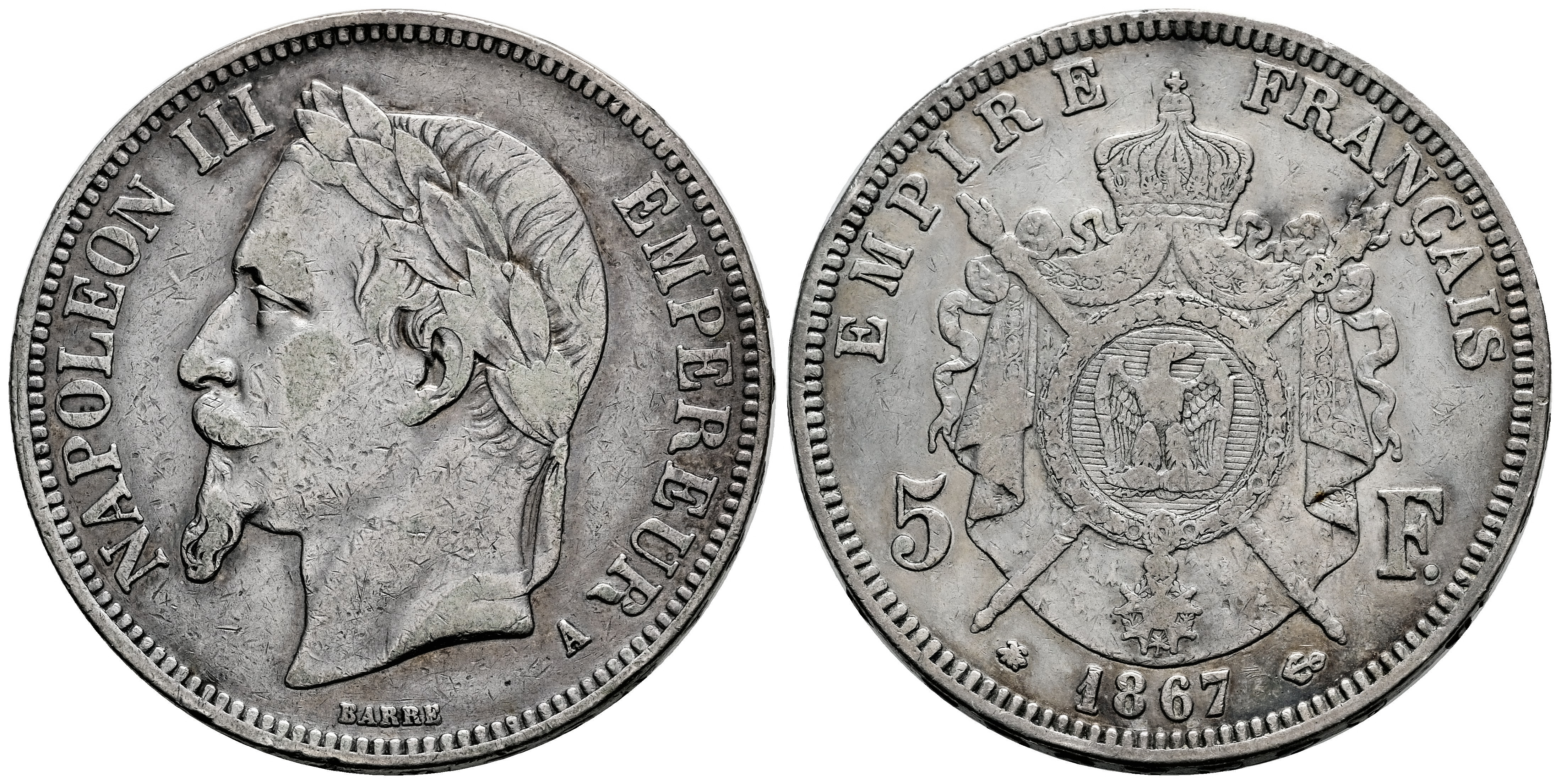 Francia. Napoleón III (1852-1870). 5 francs. 1867. París. A. (Km-799.1). (Fr-331/12). Ag. 24,82 g. Ligero tono. Marquitas. MBC/MBC-. Est...50,00.