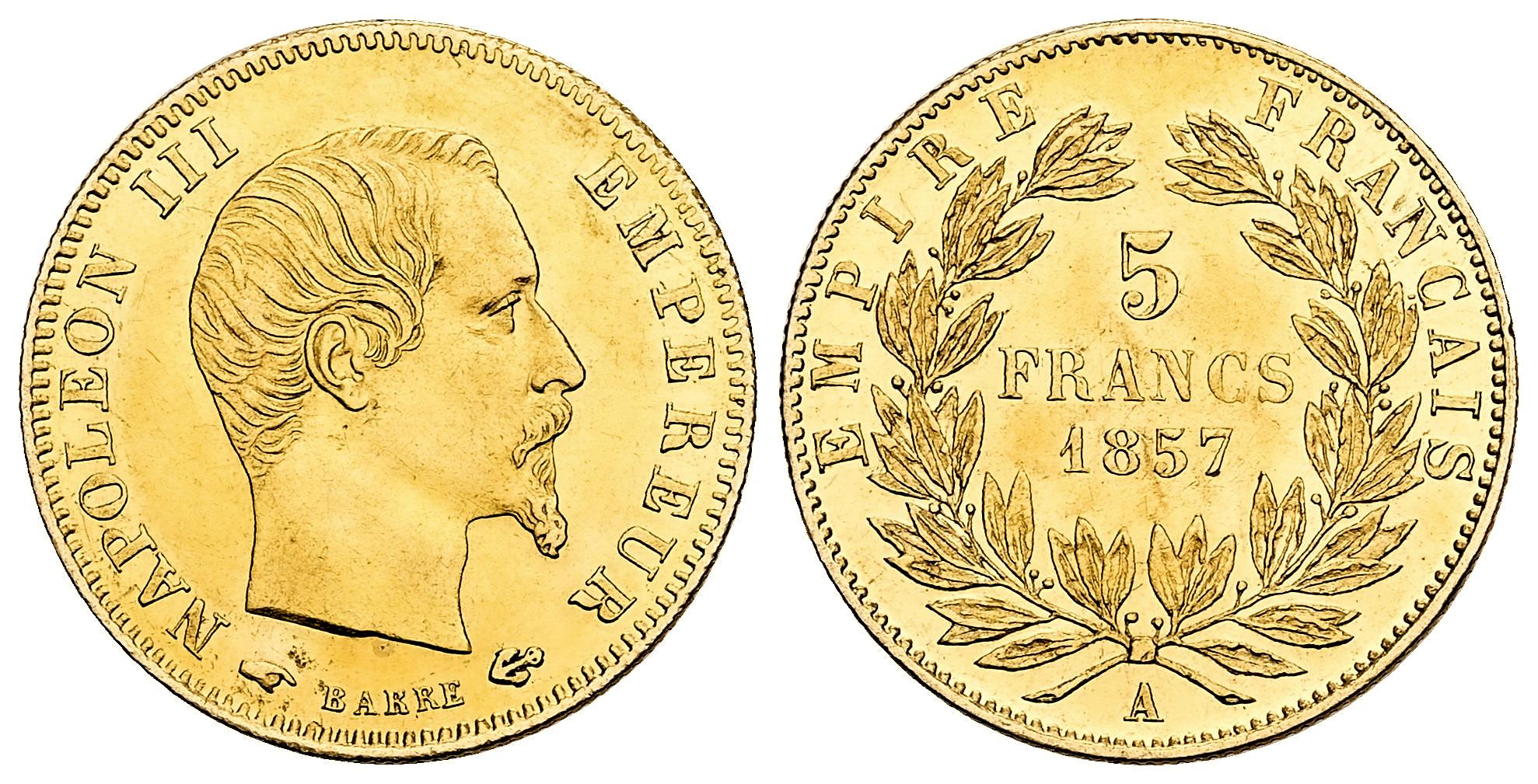 Francia. Napoleón III (1852-1870). 5 francs. 1857. París. A. (Km-787.1). Au. 1,64 g. Restos de brillo original. Ex Monedalia 8 (20/09/2022), lote 132. MBC+. Est...220,00.