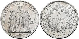 Francia. III República. 5 francs. 1877. París. A. (Km-820.1). (Gad-745a). Ag. 24,92 g. Leves marquitas. Restos de brillo original. EBC+. Est...90,00.