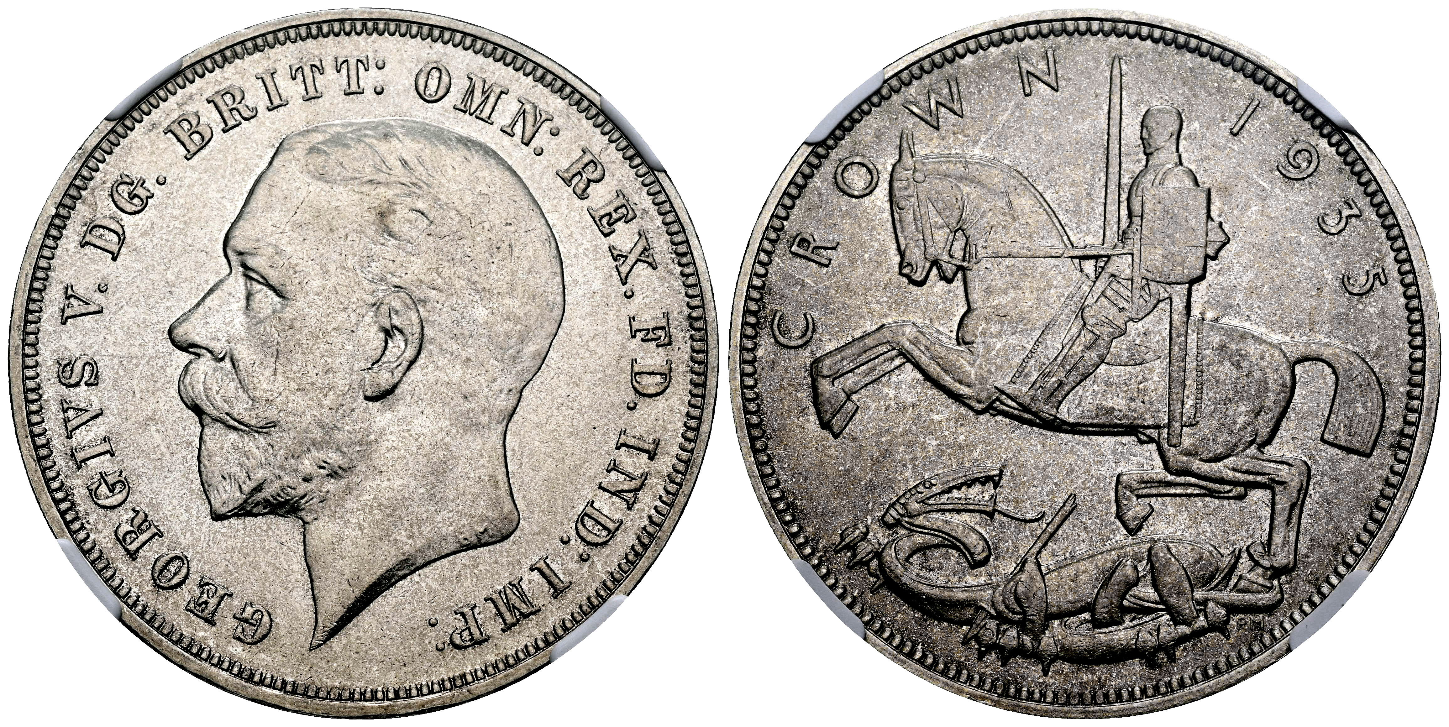 Gran Bretaña. George V. 1 crown. 1935. Tower Hill (Londres). (Km-842). (S-4048). Ag. Encapsulada por NGC como MS 62. Incuse edge lettering. Est...70,00.