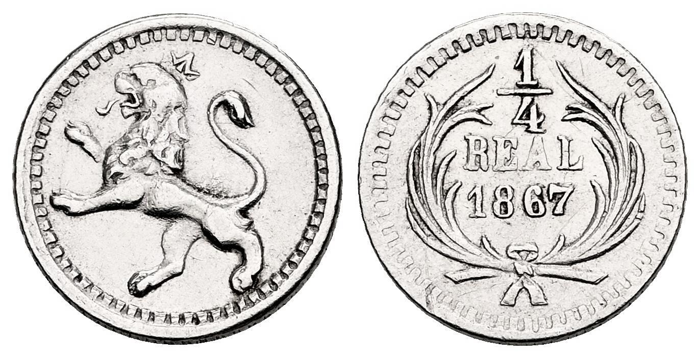 Guatemala. 1/4 real. 1867. Guatemala. (Km-130). Ag. 0,75 g. Ex Monedalia 6 (30/11/2021), lote 373. MBC+/MBC. Est...30,00.