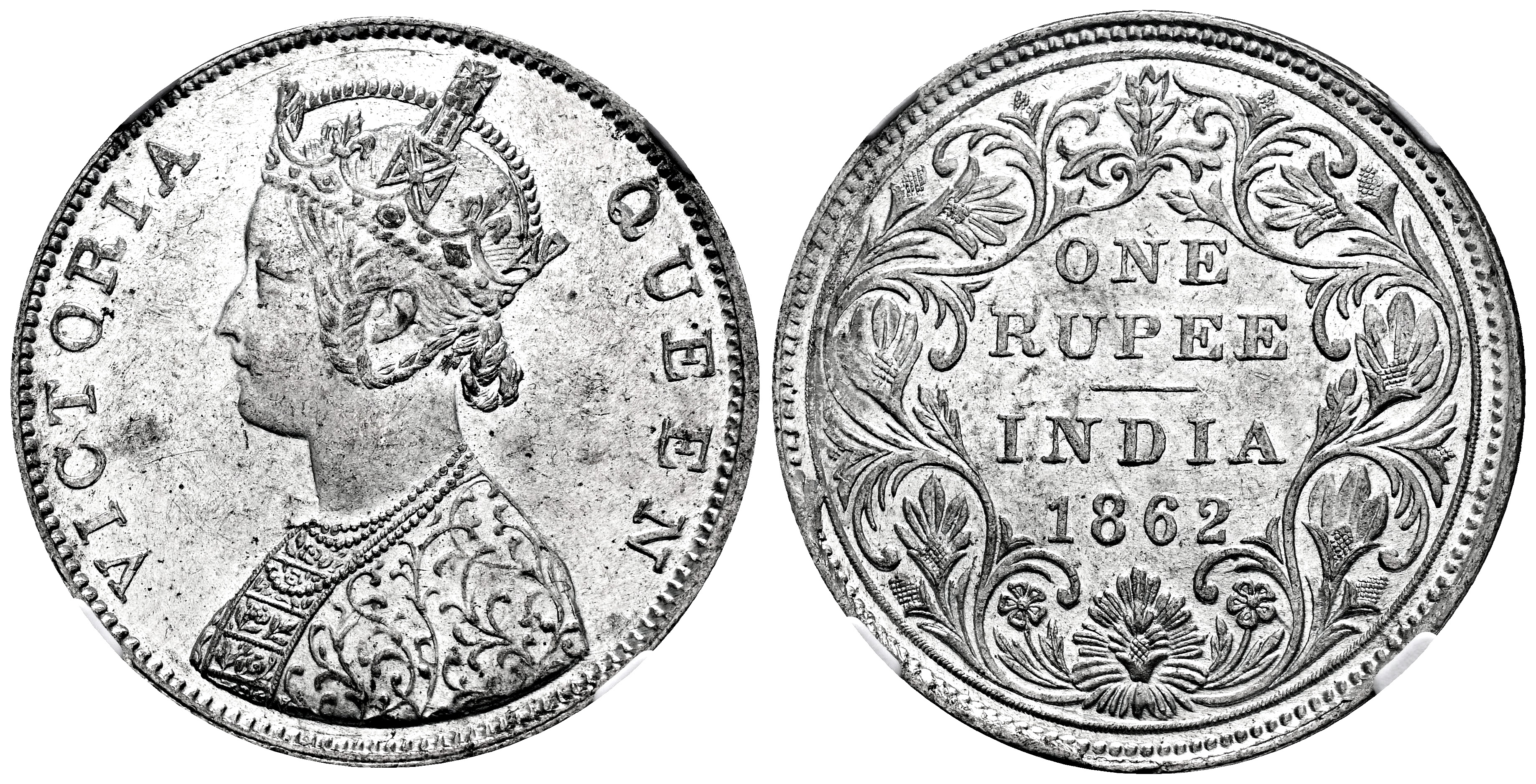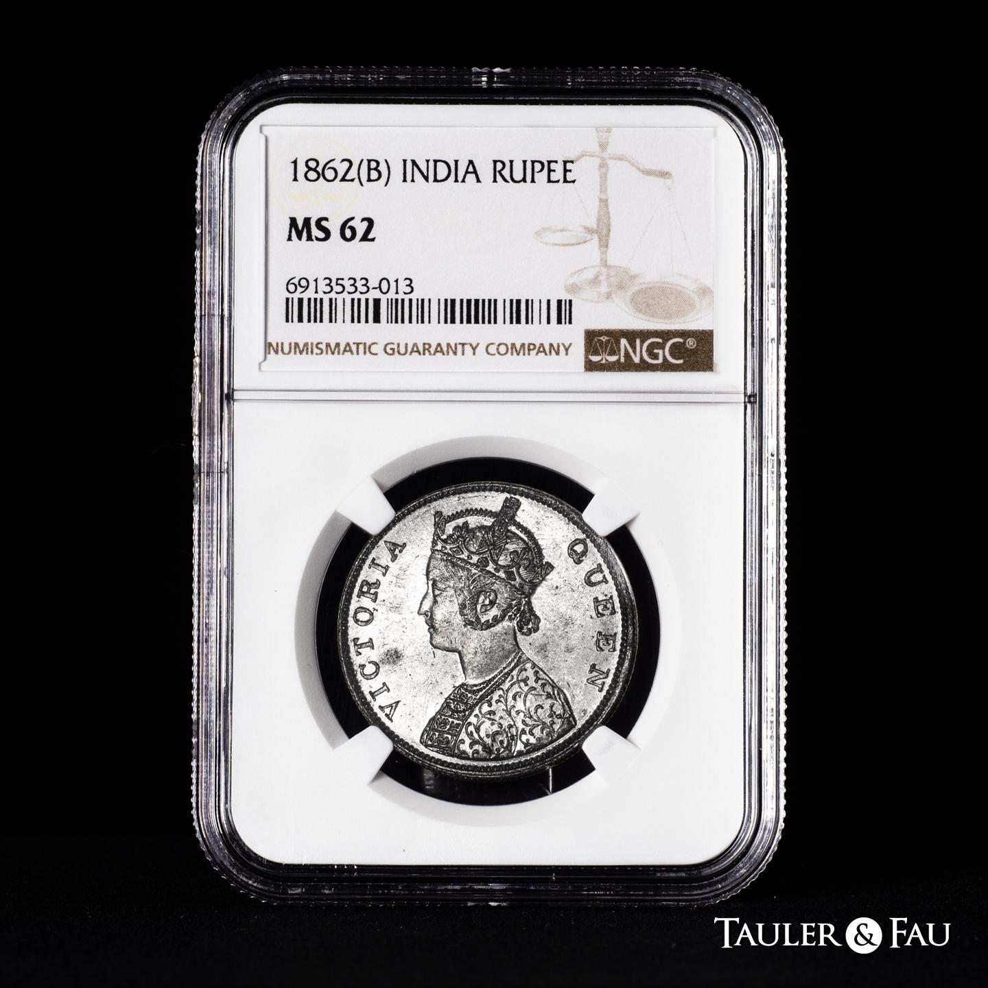 India Británica. Victoria (1837-1901). 1 rupee. 1862. Bombay. B. (Km-473.1). (S&W-4.57A). Ag. Pleno brillo original. Encapsulada por NGC como MS 62. NGC-MS. Est...120,00.