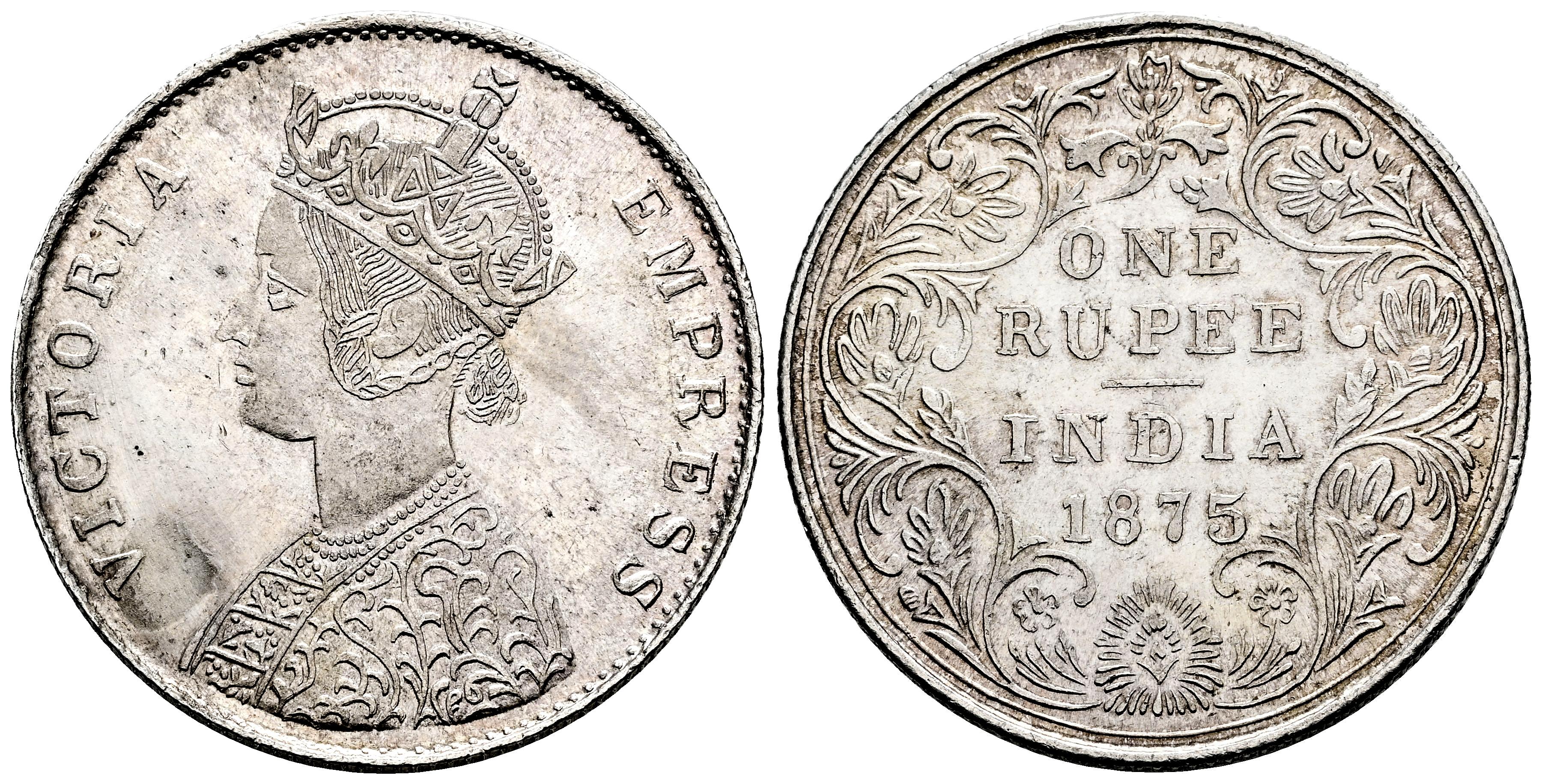 India Británica. 1 rupee. 1875. Bombay. (Km-473). Ag. 11,47 g. Golpe en el canto. Brillo original. EBC+. Est...45,00.