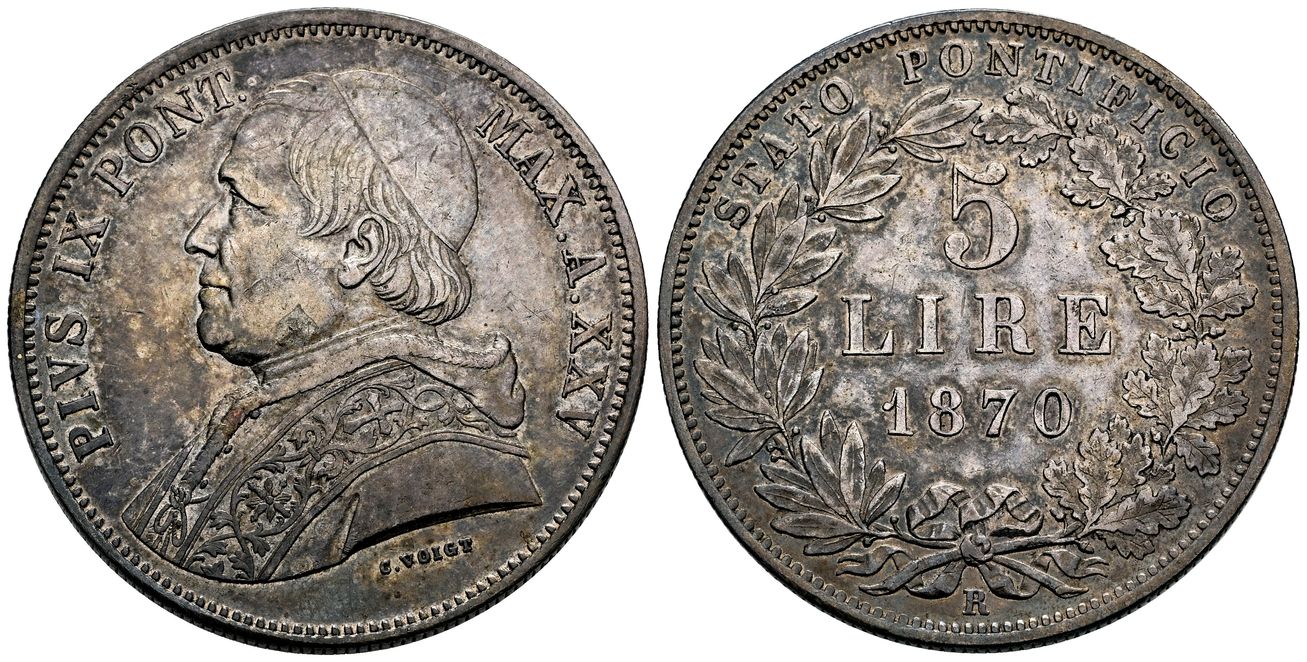 Italia. Estados Papales. Pío IX. 5 lire. 1870 (Anno XXV). Roma. R. (Km-1385). (Mont-363). (Pagani-549). Ag. 24,97 g. Ligera pátina. MBC+. Est...75,00.