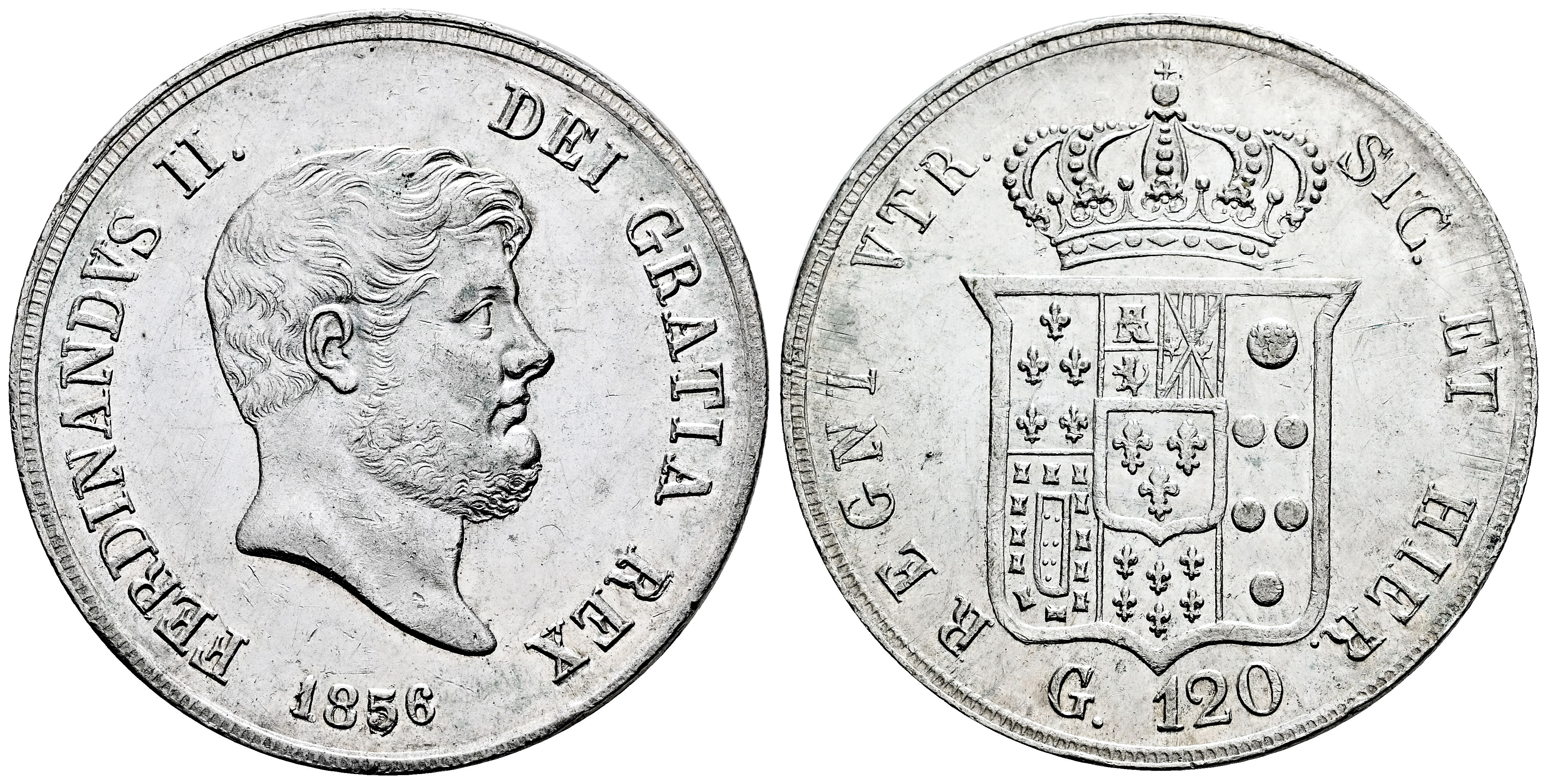 Italia. Ferdinando II. 120 grana. 1856. Nápoles. (Km-370). Ag. 27,47 g. Suaves rayitas y pequeñas marcas. Brillo original. EBC/EBC+. Est...180,00.