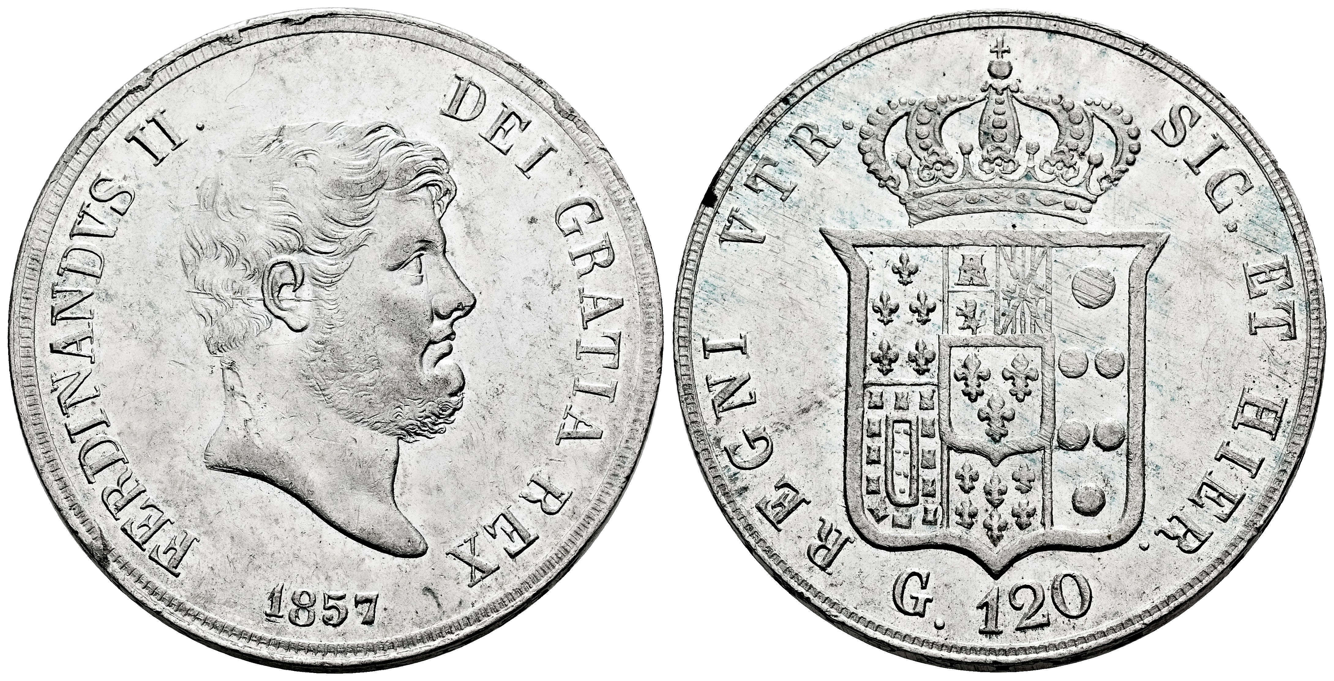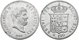Italia. Ferdinando II. 120 grana. 1857. Nápoles. (Km-222). Ag. 27,38 g. Restos de verdín. Alguna raya. Restos de brillo original. EBC. Est...150,00.