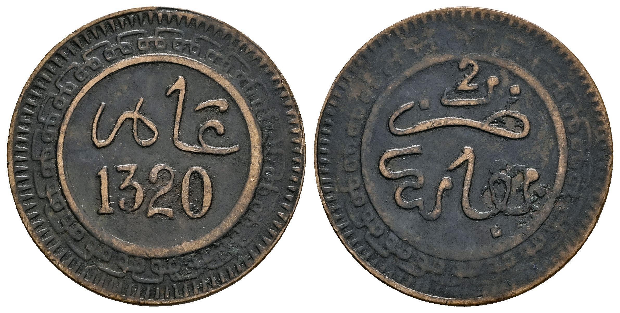 Marruecos. Abd Al-Aziz Al-Mansur (Amiríes). 2 mazunas. 1320 H. Fez. (Km-Y#15.2). Ae. 2,02 g. Muy escasa. MBC. Est...30,00.