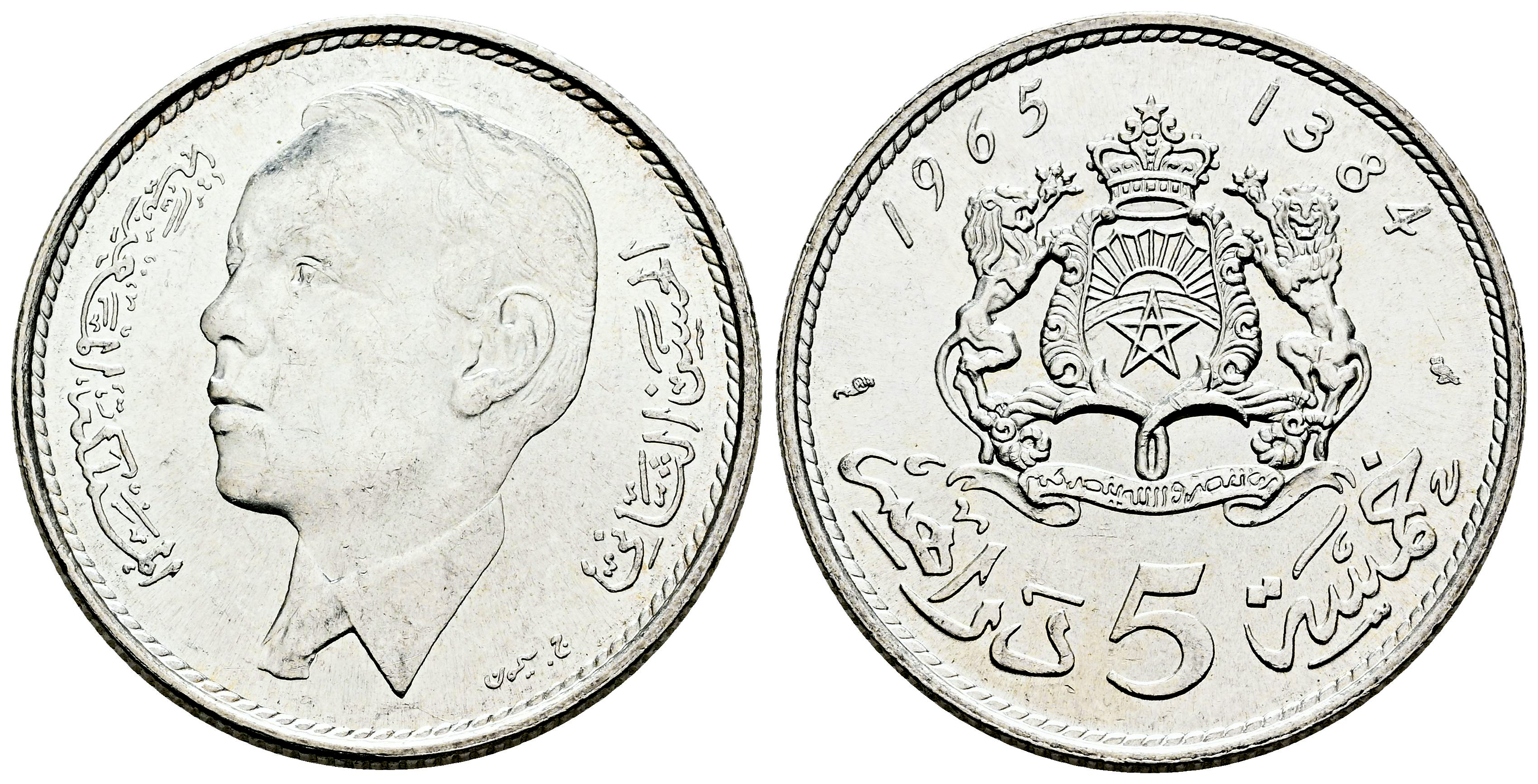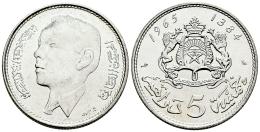 Marruecos. Hassan II. 5 dirhams. 1384 H (1965). París. (Km-Y#57). Ag. 11,80 g. Pleno brillo original. SC. Est...100,00.